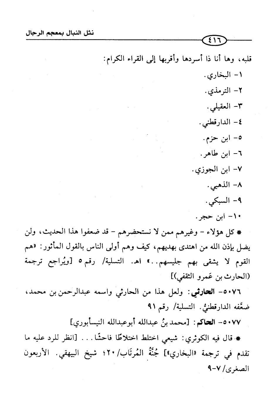 5076 - الحارثي: ولعل هذا من الحارثي واسمه عبد الرحمن بن محمَّد، ضعَّفه الدارقطنيُّ. التسلية/ رقم 91