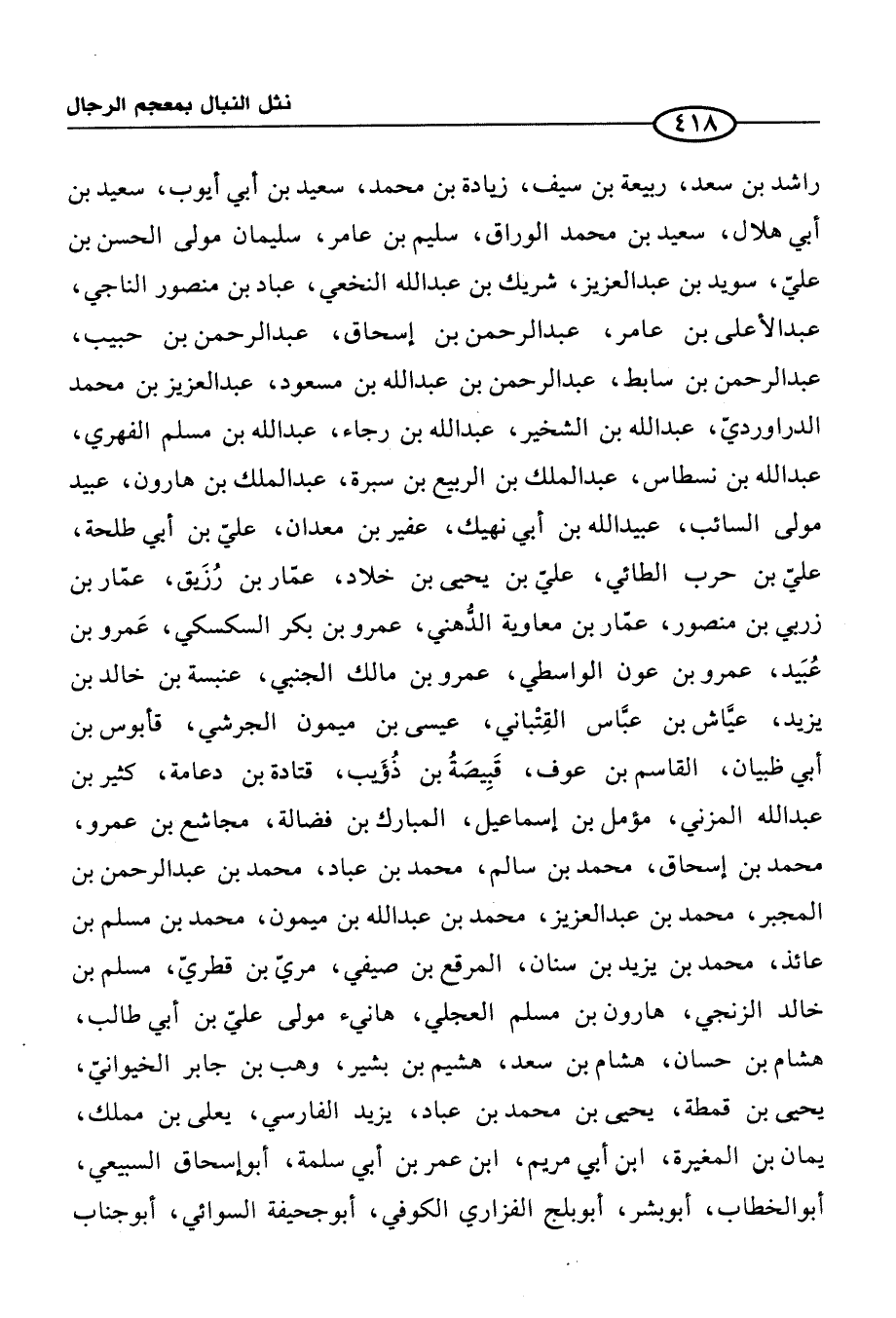 راشد بن سعد، ربيعة بن سيف، زيادة بن محمَّد، سعيد بن أبي أيوب، سعيد بن أبي هلال، سعيد بن محمَّد الوراق، سليم بن عامر، سليمان مولى الحسن بن عليّ، سويد بن عبد العزيز، شريك بن عبد الله النخعي، عباد بن منصور الناجي، عبد الأعلي بن عامر، عبد الرحمن بن إسحاق، عبد الرحمن بن حبيب، عبد الرحمن بن سابط، عبد الرحمن بن عبد الله بن مسعود، عبد العزيز بن محمَّد الدراورديّ، عبد الله بن الشخير، عبد الله بن رجاء، عبد الله بن مسلم الفهري, عبد الله بن نسطاس، عبد الملك بن الربيع بن سبرة، عبد الملك بن هارون، عبيد مولى السائب، عبيد الله بن أبي نهيك، عفير بن معدان، عليّ بن أبي طلحة، عليّ بن حرب الطائي، عليّ بن يحيى بن خلاد، عمّار بن رُزَيق، عمّار بن زربي بن منصور، عمّار بن معاوية الدُّهني، عمرو بن بكر السكسكي، عَمرو بن عُبَيد، عمرو بن عون الواسطي، عمرو بن مالك الجنبي، عنبسة بن خالد بن يزيد، عيَّاش بن عبَّاس القِتْباني، عيسى بن ميمون الجرشي، قابوس بن أبي ظبيان، القاسم بن عوف، قَبِيصَةُ بن ذُؤَيب، قتادة بن دعامة، كثير بن عبد الله المزني، مؤمل بن إسماعيل، المبارك بن فضالة، مجاشع بن عمرو، محمَّد بن إسحاق، محمَّد بن سالم، محمَّد بن عباد، محمَّد بن عبد الرحمن بن المجبر، محمَّد بن عبد العزيز، محمَّد بن عبد الله بن ميمون، محمَّد بن مسلم بن عائذ، محمَّد بن يزيد بن سنان، المرقع بن صيفي، مريّ بن قطريّ، مسلم بن خالد الزنجي، هارون بن مسلم العجلي، هانيء مولى عليّ بن أبي طالب، هشام بن حسان، هشام بن سعد، هشيم بن بشير، وهب بن جابر الخيوانيّ، يحيى بن قمطة، يحيى بن محمَّد بن عباد، يزيد الفارسي، يعلي بن بملك، يمان بن المغيرة، ابن أبي مريم، ابن عمر بن أبي سلمة، أبو إسحاق السبيعي، أبو الخطاب، أبو بشر، أبو بلج الفزاري الكوفي، أبو جحيفة السوائي، أبو جناب