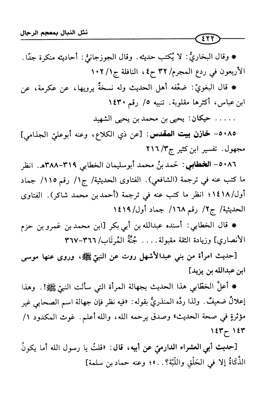 5086 - الخطابي: حَمد بنُ محمد أبو سليمان الخطابي 319 - 388 هـ. انظر ما كتب عنه في ترجمة (الشافعي). الفتاوى الحديثية/ ج1/ رقم 115/ جماد أول / 1418؛ انظر ما كتب عنه في ترجمة (أحمد بن محمد شاكر). الفتاوى الحديثية/ ج 2/ رقم 168/ جماد أول / 1419