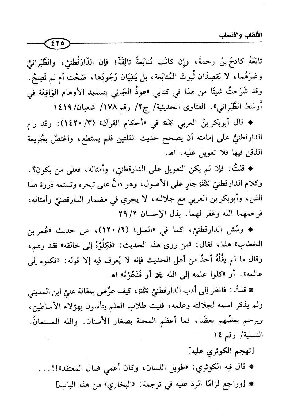 * قلتُ: فإن لم يكن التعويل على الدارقطنيّ، وأمثاله، فعلى من يكون؟. وكلام الدارقطنيّ رحمه الله جارٍ على الأصول، وهو دالٌّ على تبحره وتسنمه ذروة هذا الفن, وأبو بكر بن العربي مع جلالته، لا يجري في مضمار الدارقطنيّ وأمثاله، فرحمهما الله وغفر لهما. بذل الإحسان 2/ 29