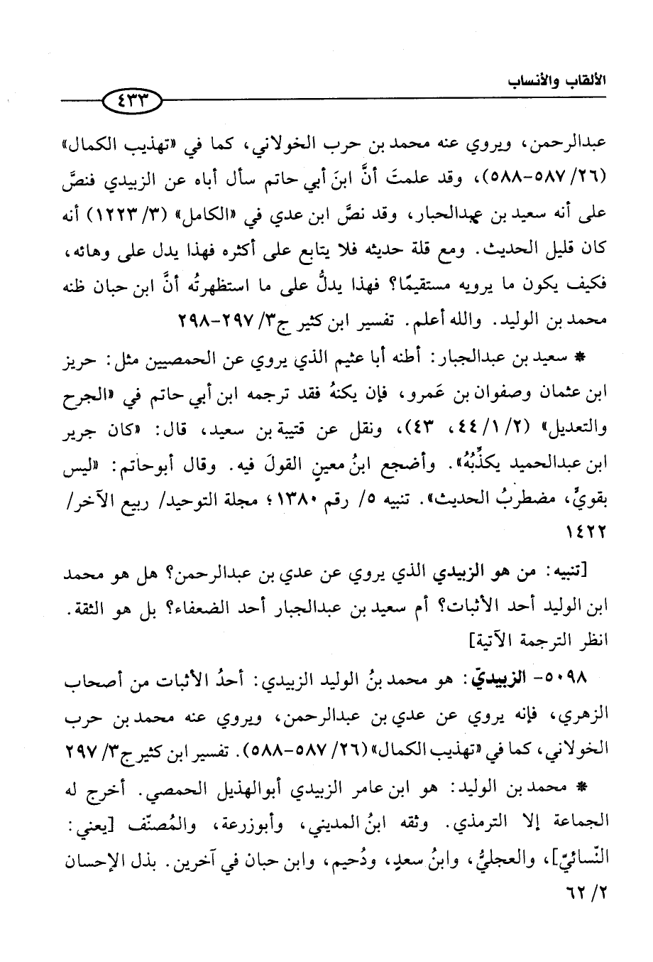 5098 - الزبيديّ: هو محمَّد بنُ الوليد الزبيدي: أحدُ الأثبات من أصحاب الزهري، فإنه يروي عن عدي بن عبد الرحمن، ويروي عنه محمَّد بن حرب الخولاني، كما في "تهذيب الكمال" (26/ 587 - 588). تفسير ابن كثير ج 3/ 297