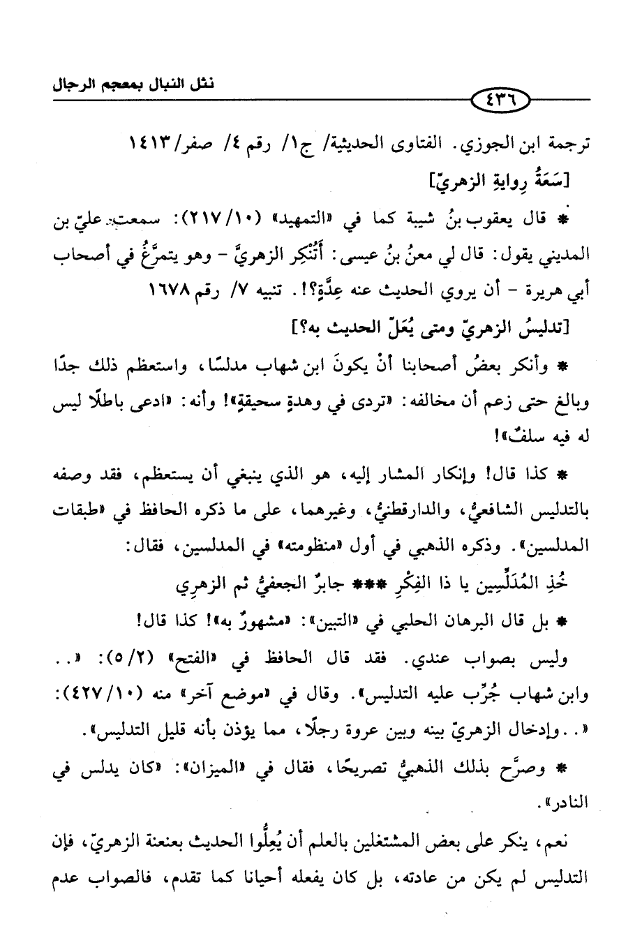 * وأنكر بعضُ أصحابنا أنْ يكونَ ابن شهاب مدلسًا، واستعظم ذلك جدًا وبالغ حتى زعم أن مخالفة: "تردى في وهدةٍ سحيقةٍ"! وأنه: "ادعى باطلًا ليس له فيه سلفٌ"!