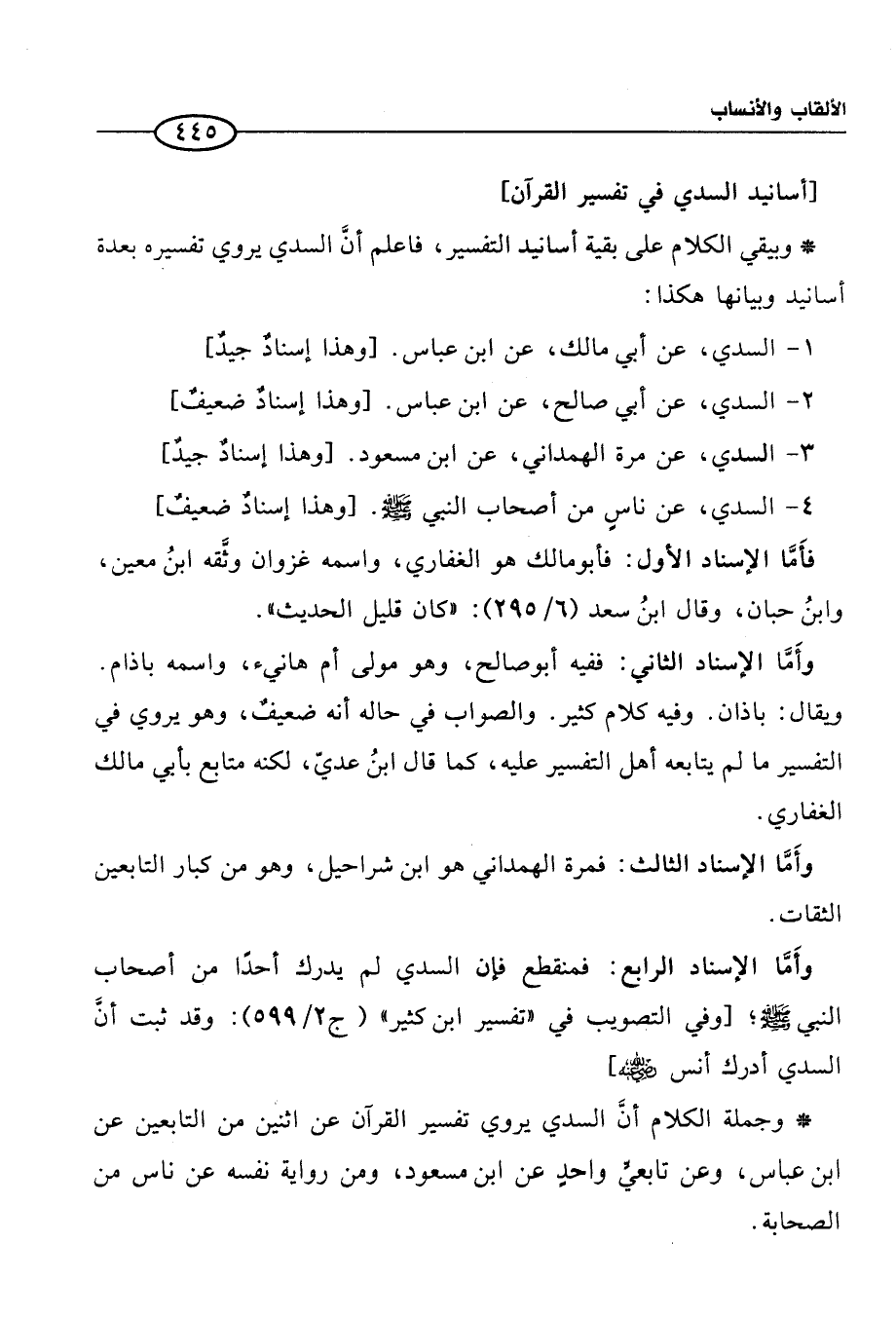 4 - السدي، عن ناسٍ من أصحاب النبي -صلى الله عليه وسلم-. [وهذا إسنادٌ ضعيفٌ] فأَمَّا الإسناد الأول: فأبو مالك هو الغفاري، واسمه غزوان وثَّقه ابنُ معين، وابن حبان، وقال ابنُ سعد (6/ 295): "كان قليل الحديث". وأَمَّا الإسناد الثاني: ففيه أبو صالح، وهو مولى أم هانئ، واسمه باذام. ويقال: باذان. وفيه كلام كثير. والصواب في حالة أنه ضعيفٌ، وهو يروي في التفسير ما لم يتابعه أهل التفسير عليه، كما قال ابنُ عديّ، لكنه متابع بأبي مالك الغفاري. وأَمَّا الإسناد الثالث: فمرة الهمداني هو ابن شراحيل، وهو من كبار التابعين الثقات. وأَمَّا الإسناد الرابع: فمنقطع فإن السدي لم يدرك أحدًا من أصحاب النبي -صلى الله عليه وسلم-؛ [وفي التصويب في "تفسير ابن كثير" (ج 2/ 599): وقد ثبت أنَّ السدي أدرك أنس -رضي الله عنه-]