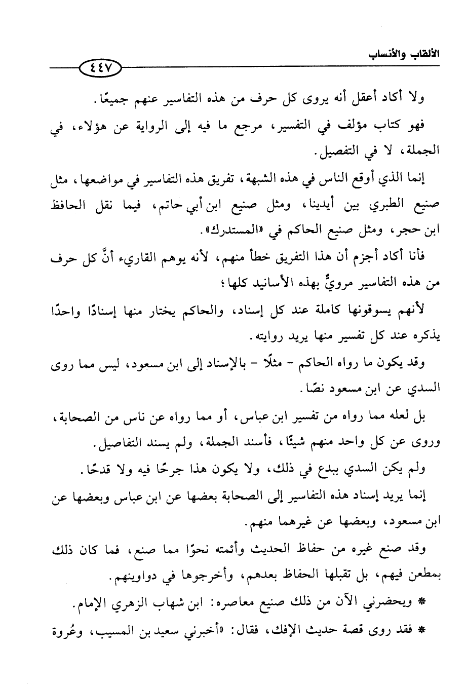 فهو كتاب مؤلف في التفسير، مرجع ما فيه إلى الرواية عن هؤلاء، في الجملة، لا في التفصيل. إنما الذي أوقع الناس في هذه الشبهة، تفريق هذه التفاسير في مواضعها، مثل صنيع الطبري بين أيدينا، ومثل صنيع ابن أبي حاتم، فيما نقل الحافظ ابن حجر، ومثل صنيع الحاكم في "المستدرك". فأنا أكاد أجزم أن هذا التفريق خطأ منهم, لأنه يوهم القارئ أنَّ كل حرف من هذه التفاسير مرويٌّ بهذه الأسانيد كلها؛ لأنهم يسوقونها كاملة عند كل إسناد، والحاكم يختار منها إسنادًا واحدًا يذكره عند كل تفسير منها يريد روايته. وقد يكون ما رواه الحاكم -مثلًا- بالإسناد إلى ابن مسعود، ليس مما روى السدي عن ابن مسعود نصًا. بل لعله مما رواه من تفسير ابن عباس، أو مما رواه عن ناس من الصحابة، وروى عن كل واحد منهم شيئًا، فأسند الجملة، ولم يسند التفاصيل.