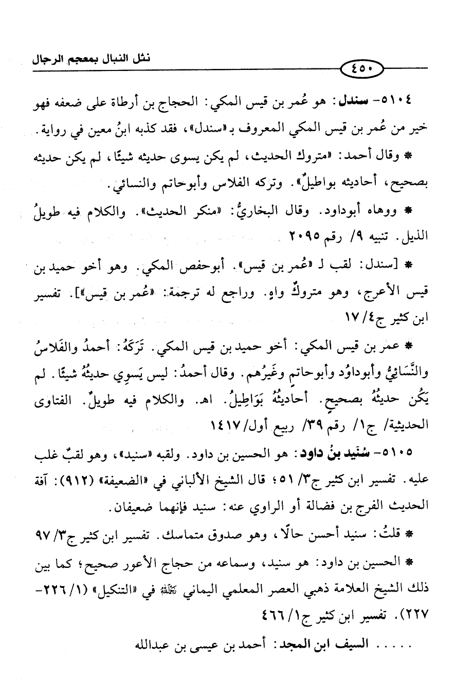 5104 - سندل: هو عُمر بن قيس المكي: الحجاج بن أرطأة على ضعفه فهو خير من عُمر بن قيس المكي المعروف بـ"سندل"، فقد كذبه ابنُ معين في رواية.