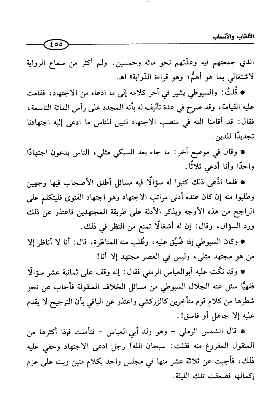 * قُلتُ: والسيوطي يشير في آخر كلامه إلى ما ادعاه من الاجتهاد، فقامت عليه القيامة، وقد صرح في عدة تآليف له بأنه المجدد على رأس المائة التاسعة، فقال: قد أقامنا الله في منصب الاجتهاد لنبين للناس ما ادعى إليه اجتهادنا تجديدًا للدين.