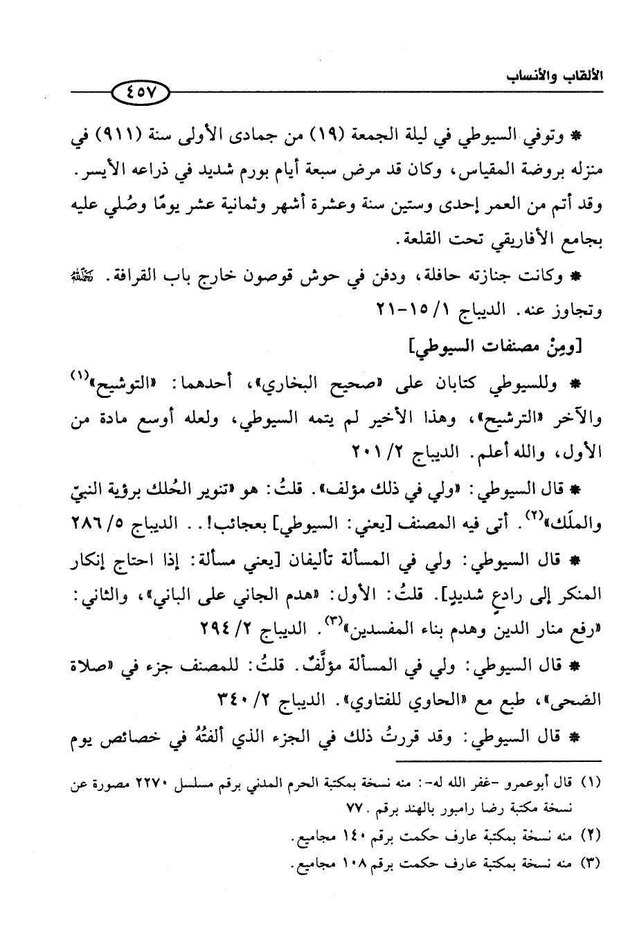 * قال السيوطي: ولي في المسألة تأليفًان [يعني مسألة: إذا احتاج إنكار المنكر إلى رادعٍ شديدٍ]. قلتُ: الأول: "هدم الجاني على الباني"، والثاني: "رفع منار الدين وهدم بناء المفسدين" (3). الديباج 2/ 294