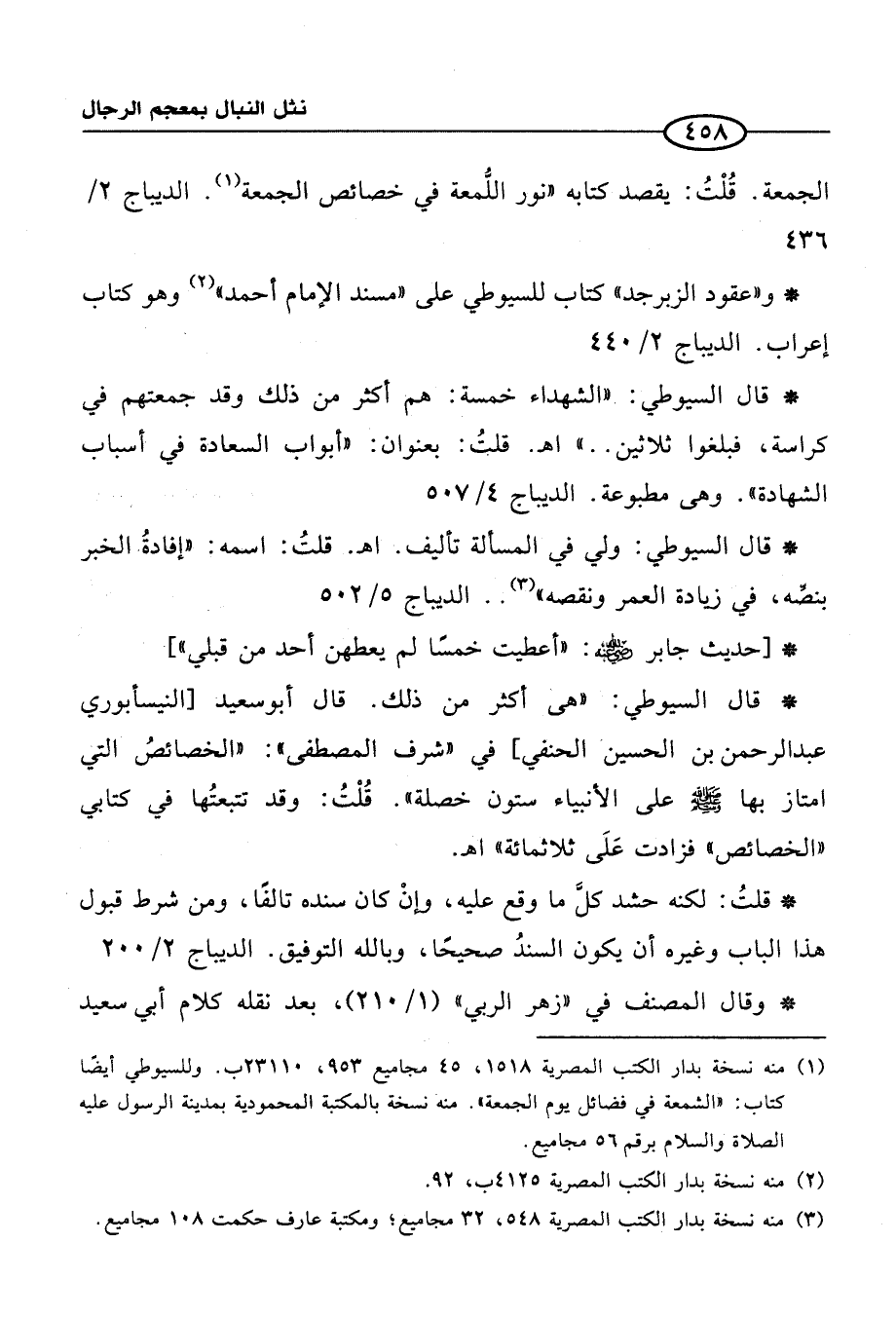 (1) منه نسخة بدار الكتب المصرية 1518، 45 مجاميع 953، 23110 ب. وللسيوطي أيضًا كتاب: "الشمعة في فضائل يوم الجمعة". منه نسخة بالمكتبة المحمودية بمدينة الرسول عليه الصلاة والسلام برقم 56 مجاميع.