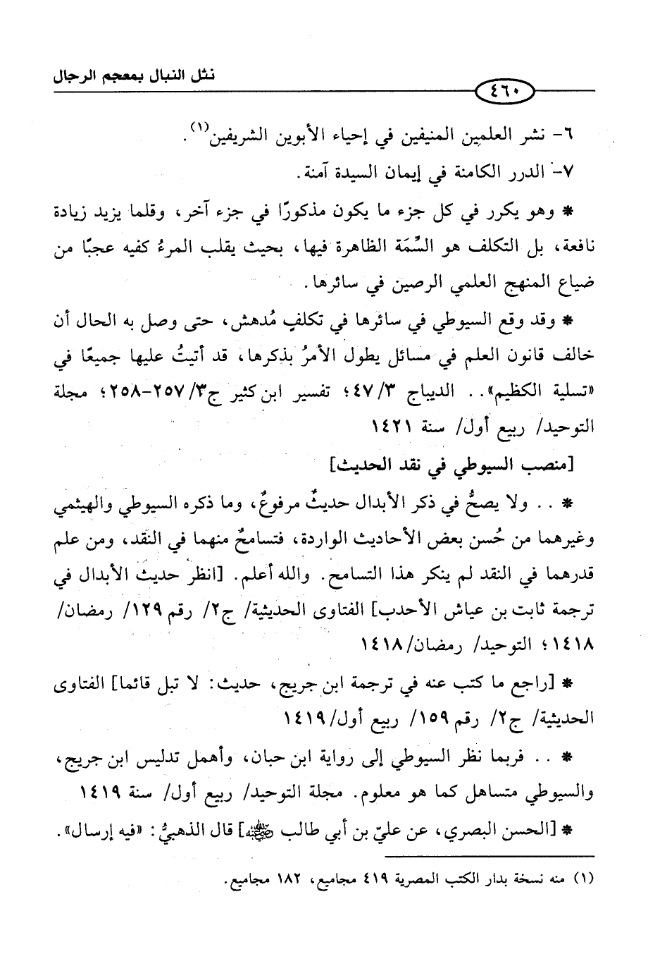 * وقد وقع السيوطي في سائرها في تكلفٍ مُدهش، حتى وصل به الحال أن خالف قانون العلم في مسائل يطول الأمرُ بذكرها، قد أتيتُ عليها جميعًا في "تسلية الكظيم". . الديباج 3/ 47؛ تفسير ابن كثير ج 3/ 257 - 258؛ مجلة التوحيد/ ربيع أول/ سنة 1421