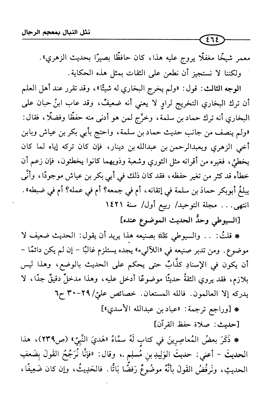 الوجه الثالث: قول: "ولم يخرج البخاري له شيئًا"، وقد تقرر عند أهل العلم أن ترك البخاري التخريج لراوٍ لا يعني أنه ضعيفٌ، وقد عاب ابنُ حبان على البخاري أنه ترك حماد بن سلمة، وخرَّج لمن هو أدنى منه حفظًا وفضلًا، فقال: "ولم ينصف من جانب حديث حماد بن سلمة، واحتج بأبي بكر بن عياش وبابن أخي الزهري وبعبد الرحمن بن عبد الله بن دينار، فإن كان تركه إياه لما كان يخطيُ، فغيره من أقرانه مثل الثوري وشعبة وذويهما كانوا يخطئون، فإن زعم أن خطأه قد كثر من تغير حفظه، فقد كان ذلك في أبي بكر بن عياش موجودًا، وأنَّى يبلغُ أبو بكر حمادَ بن سلمة في إتقانه، أم في جمعه؟ أم في عمله؟ أم في ضبطه". انتهى. . . مجلة التوحيد/ رييع أول/ سنة 1421