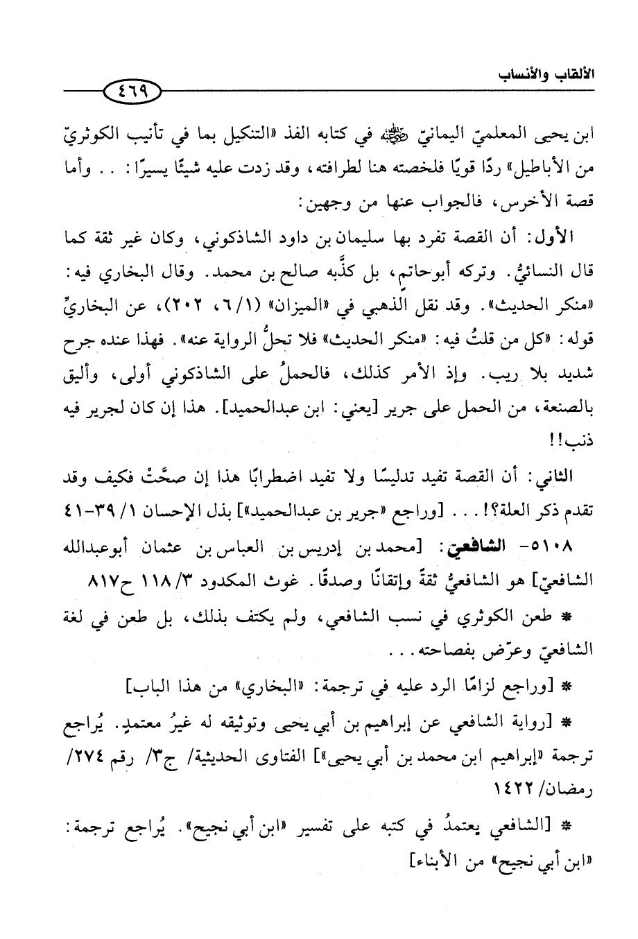 ابن يحيى المعلميّ اليمانيّ -رضي الله عنه- في كتابه الفذ "التنكيل بما في تأنيب الكوثريّ من الأباطيل" ردًا قويًا فلخصته هنا لطرافته، وقد زدت عليه شيئًا يسيرً1:. . وأما قصة الأخرس، فالجواب عنها من وجهين: الأول: أن القصة تفرد بها سليمان بن داود الشاذكوني، وكان غير ثقة كما قال النسائيُّ. وتركه أبوحاتمٍ، بل كذَّبه صالح بن محمَّد. وقال البخاري فيه: "منكر الحديث". وقد نقل الذهبي في "الميزان" (1/ 6، 202)، عن البخاريِّ قوله: "كل من قلتُ فيه: "منكر الحديث" فلا تحلُّ الرواية عنه". فهذا عنده جرح شديد بلا ريب. وإذ الأمر كذلك، فالحملُ على الشاذكوني أولى، وأليق بالصنعة، من العمل على جرير [يعني: ابن عبد الحميد]. هذا إن كان لجرير فيه ذنب!! الثاني: أن القصة تفيد تدليسًا ولا تفيد اضطرابًا هذا إن صحَّتْ فكيف وقد تقدم ذكر العلة؟!. . . [وراجع "جرير بن عبد الحميد"] بذل "الإحسان 1/ 39 - 41