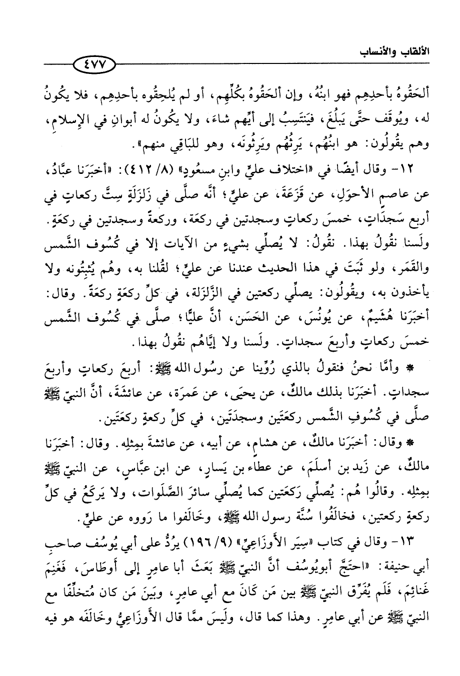 12 - وقال أيضًا في "اختلاف عليّ وابنِ مسعُودٍ" (8/ 412): "أخبَرَنا عبَّادُ، عن عاصمٍ الأحوَلِ، عن قَزَعَةَ، عن عليٍّ؛ أنَّه صلَّى في زَلزَلَةٍ لسِتَّ ركعاتٍ في أربع سَجدَاتٍ، خمسَ ركعاتٍ وسجدتين في ركعَة، وركعةً وسجدتين في ركعَةٍ. ولَسنا نقُولُ بهذا. نقُولُ: لا يُصلِّي بشيءٍ من الآيات إلا في كُسُوف الشَّمس والقَمَر، ولو ثَبَتَ في هذا الحديث عندنا عن عليٍّ؛ لقُلنا به، وهُم يُثبِتُونه ولا يأخذون به، ويقُولُون: يصلِّي ركعتين في الزَّلزَلة، في كلّ ركعَةٍ ركعَةً. وقال: أخبَرَنا هُشَيمٌ، عن يُونُسَ، عن الحسَن، أنَّ عليًّا؛ صلَّى في كُسُوف الشَّمس خمس ركعاتٍ وأربعَ سجداتٍ. ولَسنا ولا إيَّاهُم نقُولُ بهذا.