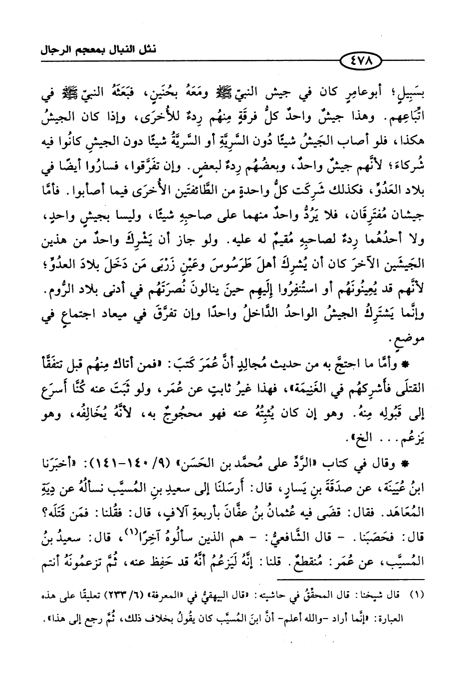 (1) قال شيخنا: قال المحقِّقُ في حاشيته: "قال البيهقيُّ في "المعرفة" (6/ 233) تعليقًا على هذه العبارة: "إنَّما أراد -والله أعلم- أنَ ابنَ المُسيَّب كان يقُولُ بخلاف ذلك، ثُمَّ رجع إلى هذا".