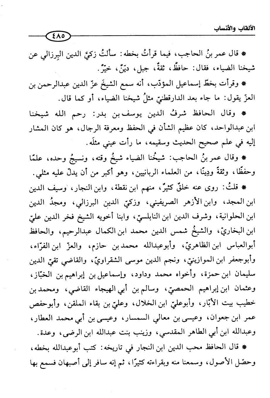 * قال عمر بنُ الحاجب، فيما قرأتُ بخطه: سألتُ زكيَّ الدين البِرزالي عن شيخنا الضياء، فقال: حافظٌ، ثقةٌ، جبل، ديّنٌ، خيّرٌ.