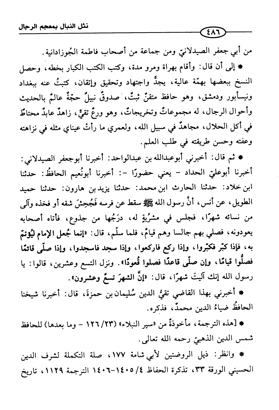 * ثم قال: أخبرني أبو عبد الله بن عبد الواحد: أخبرنا أبو جعفر الصيدلاني: أخبرنا أبو عليّ الحداد -يعني حضورًا-: أخبرنا أبو نُعيم الحافظُ: حدثنا ابن خلاد: حدثنا الحارث ابن مُحَمَّد: حدثنا يزيد بن هارون: حدثنا حميد الطويل، عن أنس، أنَّ رسول الله -صلى الله عليه وسلم- سقط عن فرسه فَجُحِشَ شقه أو فخذه وآلى من نسائه شهرًا، فجلس في مشرُبةٍ له، درَجُها من جذوع، فأتاه أصحابه يعودونه، فصلى بهم جالسًا وهم قيامٌ، فلما سلّم، قال: "إنما جُعل الإمام ليُوتمّ به، فإذا كبّر فكبّروا، وإذا ركع فاركعوا، وإذا سجد فاسجدوا، وإذا صلّى قائمًا فصلُّوا قيامًا، وإن صلّى قاعدًا فصلوا قُعودًا". ونزل التسع وعشرين، قالوا: يا رسول الله إنك آليتَ شهرًا، قال: "إنَّ الشهرَ تسعٌ وعشرون".