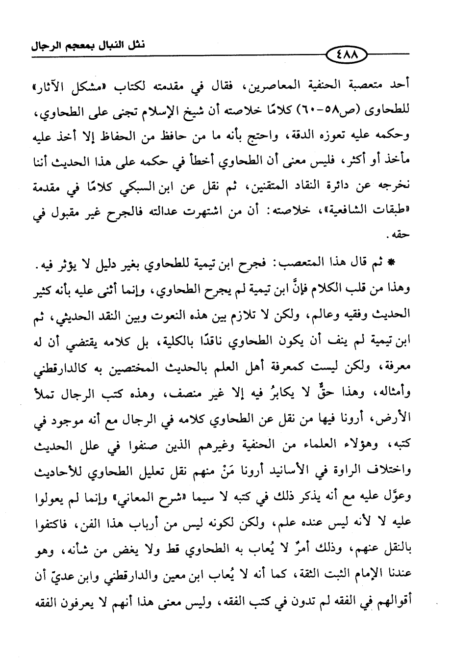 * ثم قال هذا المتعصب: فجرح ابن تيمية للطحاوي بغير دليل لا يؤثر فيه. وهذا من قلب الكلام فإنَّ ابن تيمية لم يجرح الطحاوي، وإنما أثنى عليه بأنه كثير الحديث وفقيه وعالم، ولكن لا تلازم بين هذه النعوت وبين النقد الحديثي، ثم ابن تيمية لم ينف أن يكون الطحاوي ناقدًا بالكلية، بل كلامه يقتضي أن له معرفة، ولكن ليست كمعرفة أهل العلم بالحديث المختصين به كالدارقطني وأمثاله، وهذا حقٌّ لا يكابرُ فيه إلا غير منصف، وهذه كتب الرجال تملأ الأرض، أرونا فيها من نقل عن الطحاوي كلامه في الرجال مع أنه موجود في كتبه، وهؤلاء العلماء من الحنفية وغيرهم الذين صنفوا في علل الحديث واختلاف الراوة في الأسانيد أرونا مَنْ منهم نقل تعليل الطحاوي للأحاديث وعوَّل عليه مع أنه يذكر ذلك في كتبه لا سيما "شرح المعاني" وإنما لم يعولوا عليه لا لأنه ليس عنده علم، ولكن لكونه ليس من أرباب هذا الفن، فاكتفوا بالنقل عنهم، وذلك أمر لا يُعاب به الطحاوي قط ولا يغض من شأنه، وهو عندنا الإمام الثبت الثقة، كما أنه لا يُعاب ابن معين والدارقطنيِ وابن عديّ أن أقوالهم في الفقه لم تدون في كتب الفقه، وليس معنى هذا أنهم لا يعرفون الفقه