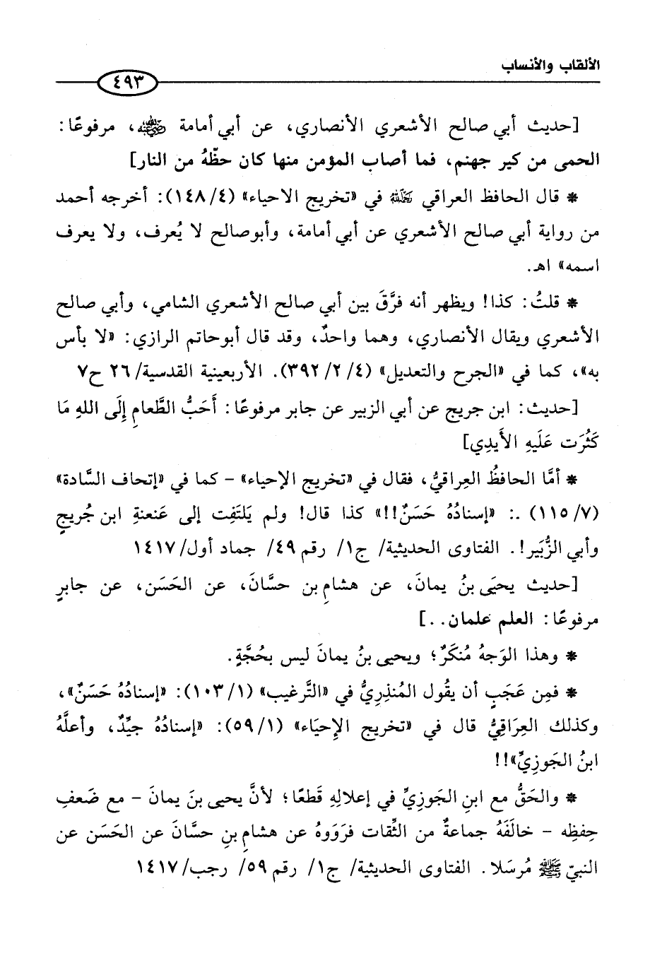 * أمَّا الحافظُ العِراقيُّ، فقال في "تخريج الإحياء" -كما في "إتحاف السَّادة" (7/ 115) -: "إسنادُهُ حَسَنٌ!! " كذا قال! ولم يَلتَفِت إلى عَنعنةِ ابن جُريجٍ وأبي الزُّبَير!. الفتاوى الحديثية/ ج 1/ رقم 49/ جماد أول/ 1417