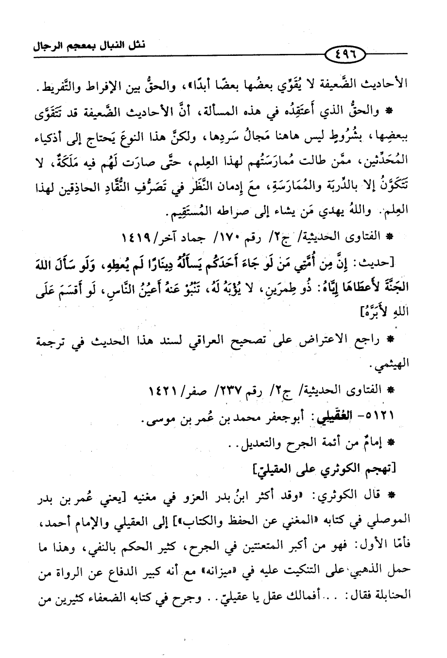 * قال الكوثري: "وقد أكثر ابنُ بدر العزو في مغنيه [يعني عُمر بن بدر الموصلي في كتابه "المغني عن الحفظ والكتاب"، إلى العقيلي والإمام أحمد، فأمّا الأول: فهو من أكبر المتعنتين في الجرح، كثير الحكم بالنفي، وهذا ما حمل الذهبي على التنكيت عليه في "ميزانه" مع أنه كبير الدفاع عن الرواة من الحنابلة فقال:. . أفمالك عقل يا عقيليّ. . وجرح في كتابه الضعفاء كثيرين من