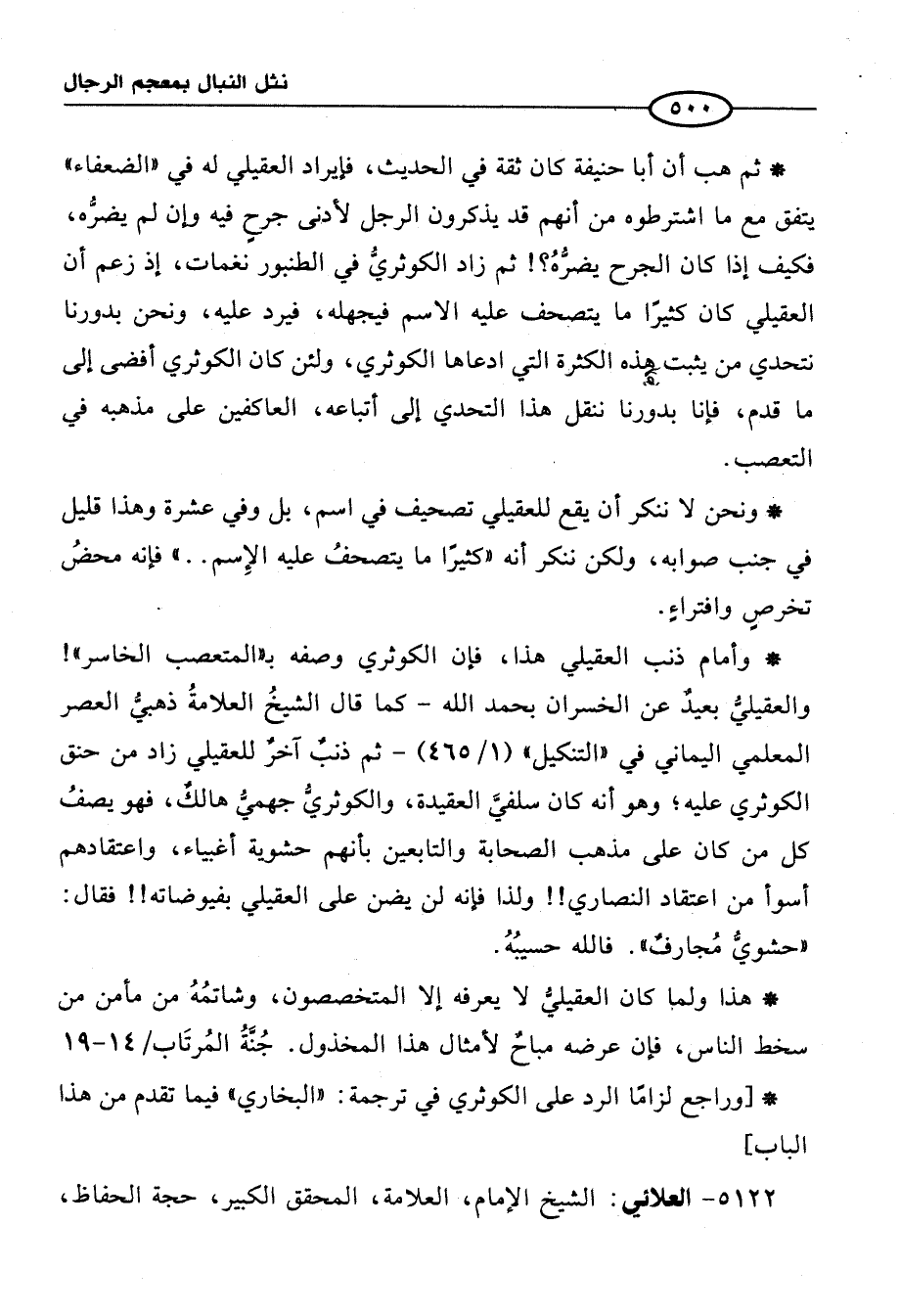 * ثم هب أن أبا حنيفة كان ثقة في الحديث، فإيراد العقيلي له في "الضعفاء" يتفق مع ما اشترطوه من أنهم قد يذكرون الرجل لأدنى جرحٍ فيه وإن لم يضرُّه، فكيف إذا كان الجرح يضرُّهُ؟! ثم زاد الكوثريُّ في الطنبور نغمات، إذ زعم أن العقيلي كان كثيرًا ما يتصحف عليه الاسم فيجهله، فيرد عليه، ونحن بدورنا نتحدى من يثبت هذه الكثرة التي ادعاها الكوثري، ولئن كان الكوثري أفضى إلى ما قدم، فإنا بدورنا ننقل هذا التحدي إلى أتباعه، العاكفين على مذهبه في التعصب.