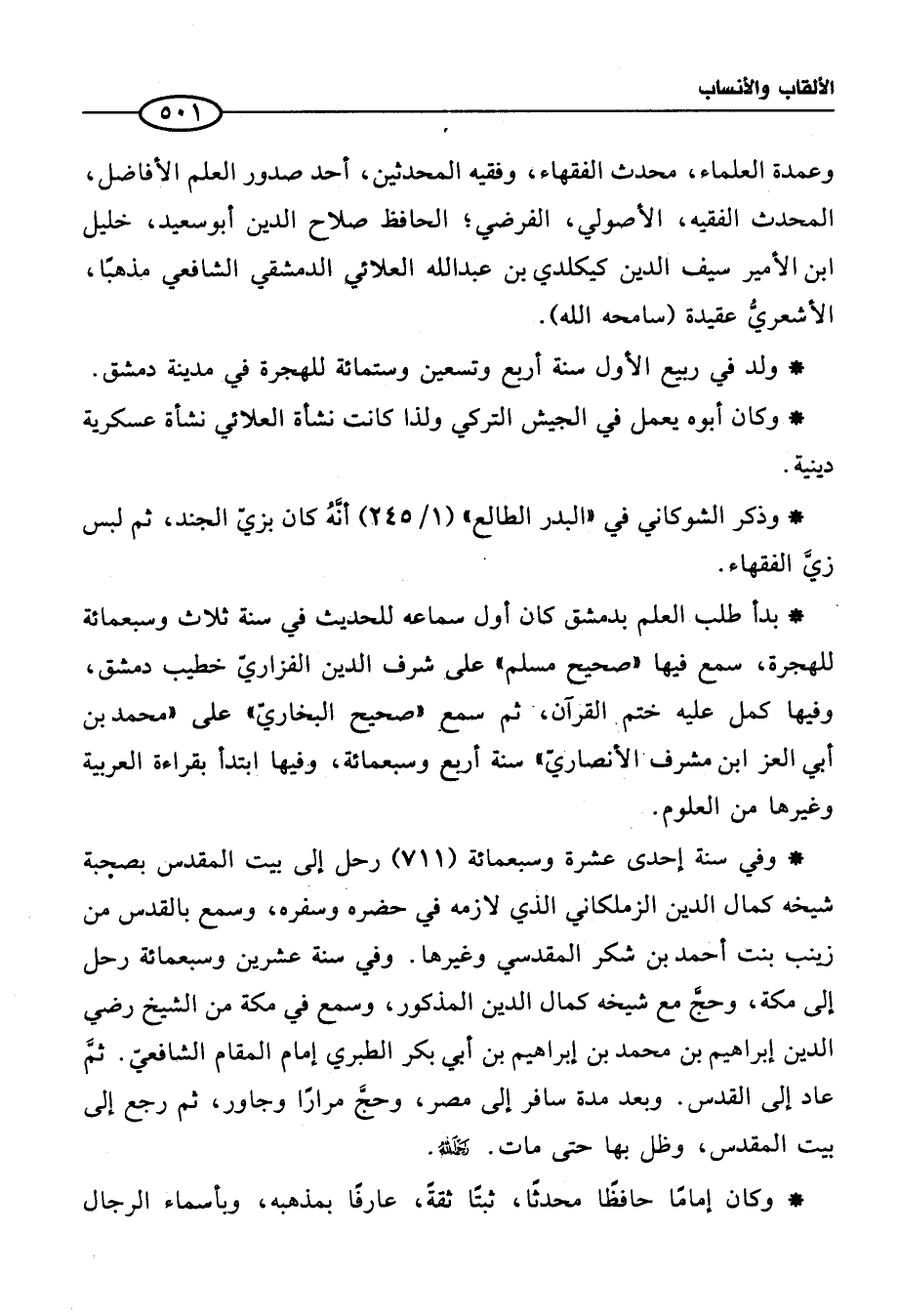 وعمدة العلماء، محدث الفقهاء، وفقيه المحدثين، أحد صدور العلم الأفاضل، المحدث الفقيه، الأصولي، الفرضي، الحافظ صلاح الدين أبو سعيد، خليل ابن الأمير سيف الدين كيكلدي بن عبد الله العلائي الدمشقي الشافعي مذهبًا، الأشعريُّ عقيدة (سامحه الله).