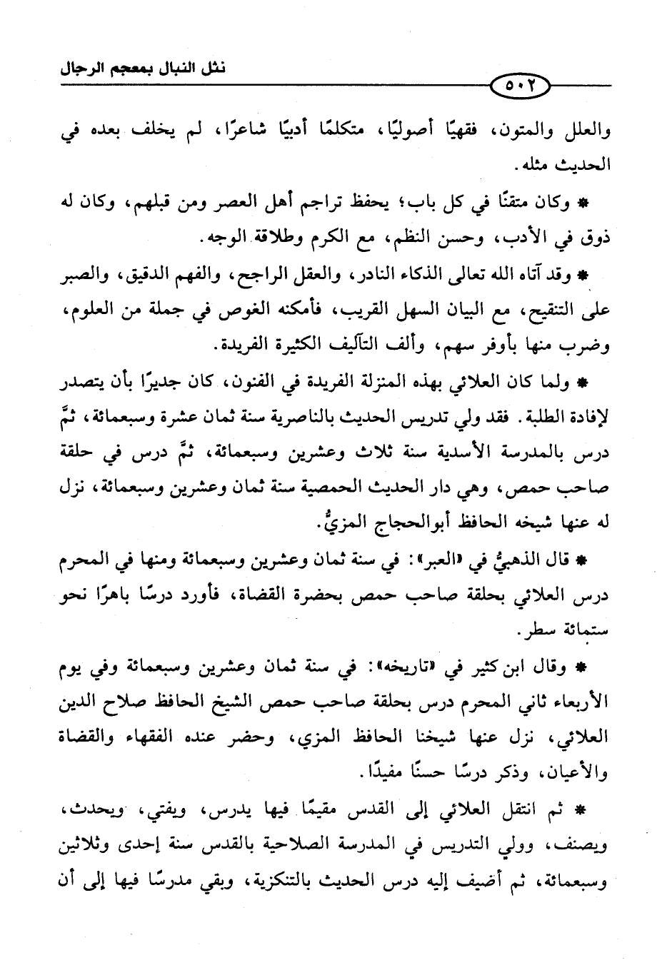 * وقال ابن كثير في "تاريخه": في سنة ثمان وعشرين وسبعمائة وفي يوم الأربعاء ثاني المحرم درس بحلقة صاحب حمص الشيخ الحافظ صلاح الدين العلائي، نزل عنها شيخنا الحافظ المزي، وحضر عنده الفقهاء والقضاة والأعيان، وذكر درسًا حسنًا مفيدًا.