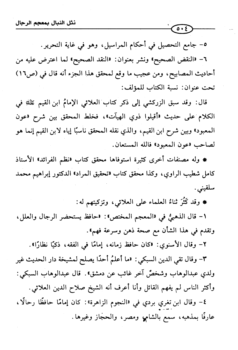 6 - "النقض الصحيح" ونشر بعنوان: "النقد الصحيح" لما أعترض عليه من أحاديث المصابيح، ومن عجيب ما وقع لمحقق هذا الجزء أنه قال في (ص 16) تحت عنوان: نسبة الكتاب للمؤلف: قال: وقد سبق الزركشي إلى ذكر كتاب العلائي الإمامُ ابن القيم -رحمه الله- في الكلام على حديث "أقيلوا ذوي الهيآت"، فخلط المحقق بين شرح "عون المعبود" وبين شرح ابن القيم، والذي نقله المحقق ناسبًا إياه لابن القيم إنما هو لصاحب "عون المعبود" فالله المستعان.