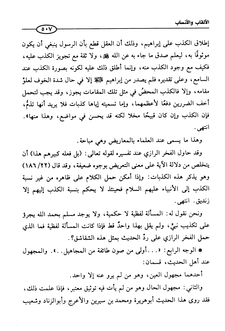 وقد حاول الفخر الرازي عند تفسيره لقوله تعالى: (بل فعله كبيرهم هذا) أن يتخلص من دلالة الآية على معنى التعريض بوجوه ضعيفة، وقد قال (22/ 186) وهو يذكر هذه الكذبات: وإذا أمكن حمل الكلام على ظاهره من غير نسبة الكذب إلى الأنبياء عليهم السلام فحينئذ لا يحكم بنسبة الكذب إليهم إلا زنديق. انتهى.