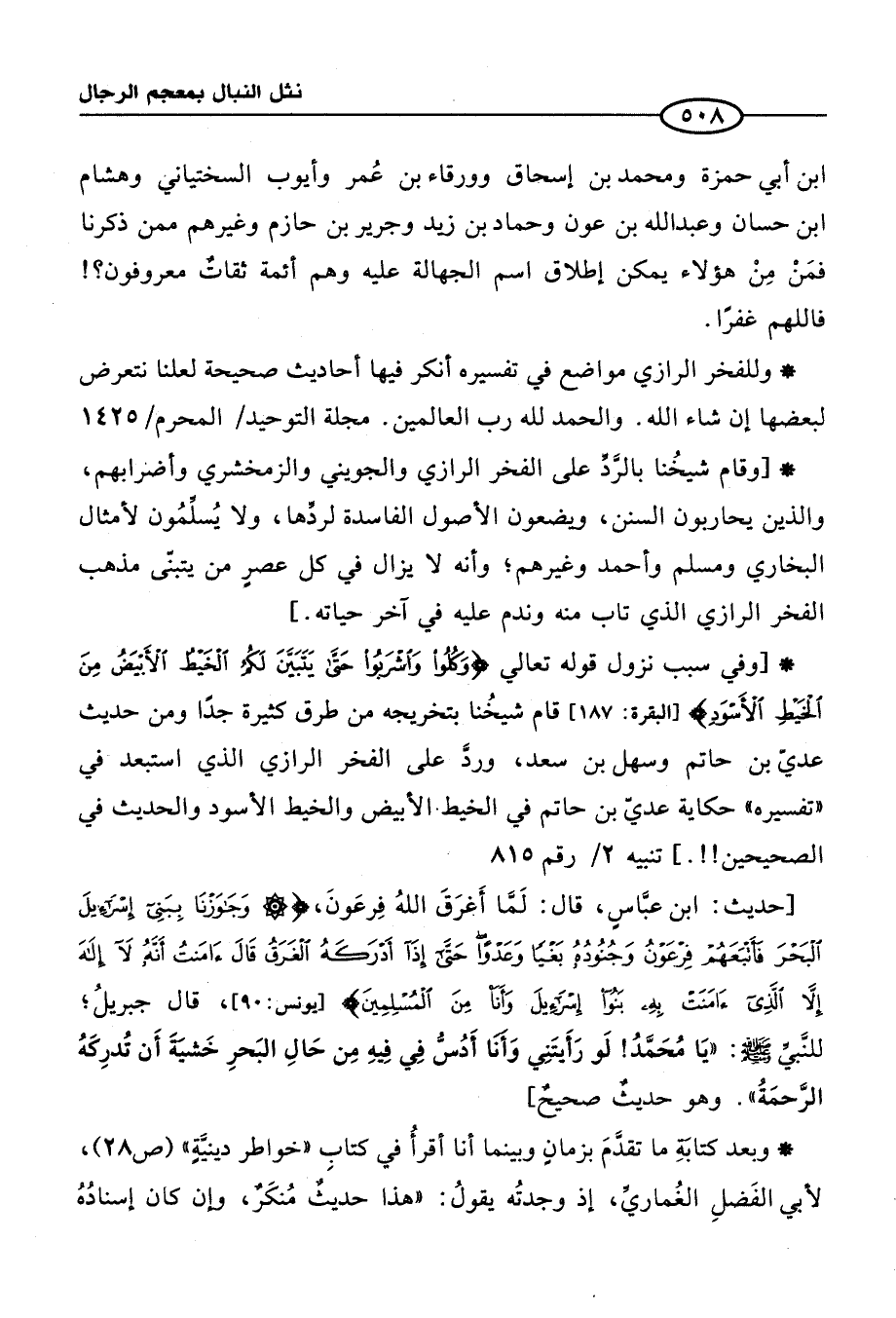 * وللفخر الرازي مواضع في تفسيره أنكر فيها أحاديث صحيحة لعلنا نتعرض لبعضها إن شاء الله. والحمد لله رب العالمين. مجلة التوحيد/ المحرم/ 1425