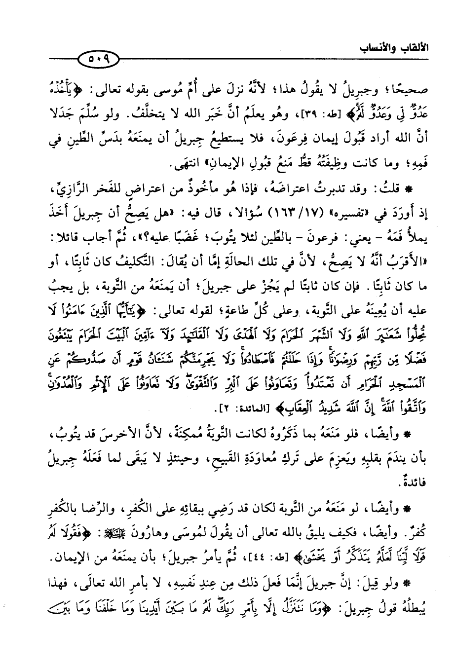 * قلتُ: وقد تدبرتُ اعتراضَهُ، فهذا هُو مأخوذ من اعتراضٍ للفَخر الرَّازِيِّ، إذ أَورَدَ في " تفسيره" (17/ 163) سُؤالا، قال فيه: "هل يَصِحُّ أن جِبريلَ أَخَذَ يملأُ فَمَهُ -يعني: فرعونَ- بالطِّين لئلا يتُوبَ؛ غَضَبًا عليه؟ "، ثُمَّ أجاب قائلًا: "الأَقرَبُ أنَّهُ لا يَصِحُّ, لأنَّ في تلك الحالَةِ إمَّا أن يُقالَ: التَّكليفُ كان ثَابِتًا، أو ما كان ثَابِتًا. فإن كان ثابتًا لم يَجُزْ على جبريلَ؛ أن يَمنَعَهُ من التَّوبة، بل يجبُ عليه أن يُعِينَهُ على التَّوبة، وعلى كُلِّ طاعةٍ؛ لقوله تعالى: {يَا أَيُّهَا الَّذِينَ آمَنُوا لَا تُحِلُّوا شَعَائِرَ اللَّهِ وَلَا الشَّهْرَ الْحَرَامَ وَلَا الْهَدْيَ وَلَا الْقَلَائِدَ وَلَا آمِّينَ الْبَيْتَ الْحَرَامَ يَبْتَغُونَ فَضْلًا مِنْ رَبِّهِمْ وَرِضْوَانًا وَإِذَا حَلَلْتُمْ فَاصْطَادُوا وَلَا يَجْرِمَنَّكُمْ شَنَآنُ قَوْمٍ أَنْ صَدُّوكُمْ عَنِ الْمَسْجِدِ الْحَرَامِ أَنْ تَعْتَدُوا وَتَعَاوَنُوا عَلَى الْبِرِّ وَالتَّقْوَى وَلَا تَعَاوَنُوا عَلَى الْإِثْمِ وَالْعُدْوَانِ وَاتَّقُوا اللَّهَ إِنَّ اللَّهَ شَدِيدُ الْعِقَابِ} [المائدة: 2].