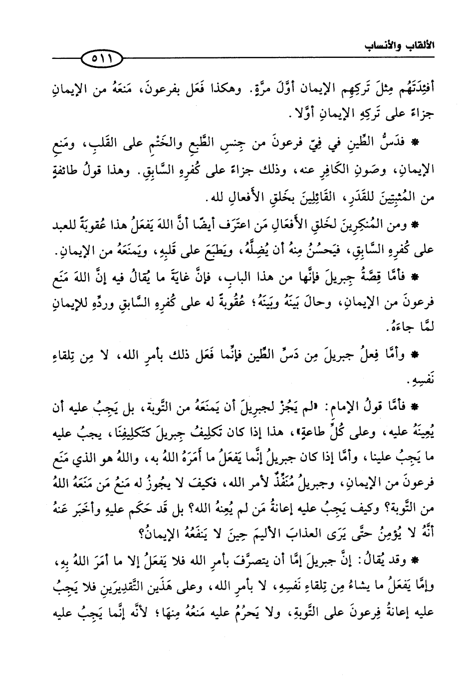 * فأمَّا قِصَّةُ جِبريلَ فإنَّها من هذا البابِ، فإنَّ غايَةَ ما يُقالُ فيه إنَّ اللهَ مَنَع فرعونَ من الإيمانِ، وحالَ بَينَهُ وبَينَهُ؛ عُقُوبةً له على كُفرِهِ السَّابقِ وردِّهِ للإيمانِ لمَّا جاءَ.