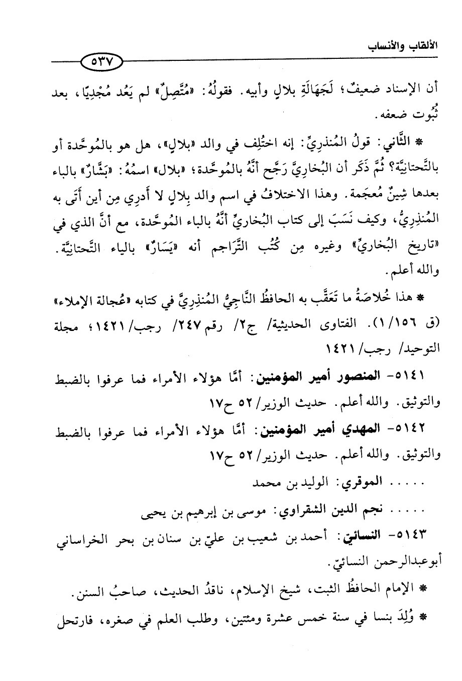 5141 - المنصور أمير المؤمنين: أمَّا هؤلاء الأمراء فما عرفوا بالضبط والتوثيق. والله أعلم. حديث الوزير/ 52 ح 17