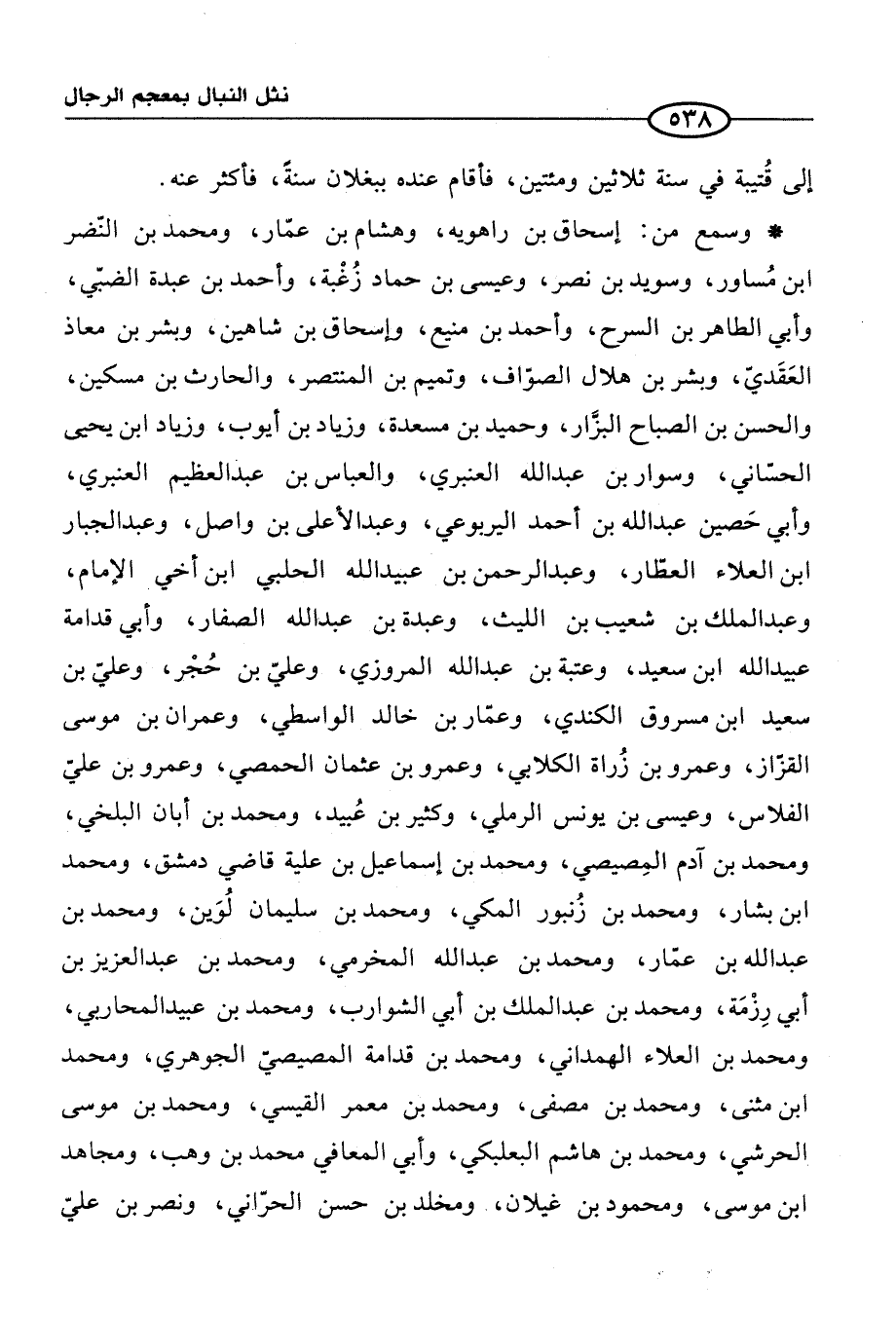 * وسمع من: إسحاق بن راهويه، وهشام بن عمّار، ومحمد بن النّضر ابن مُساور، وسويد بن نصر، وعيسى بن حماد زُغْبة، وأحمد بن عبدة الضبّي، وأبي الطاهر بن السرح، وأحمد بن منيع، وإسحاق بن شاهين، وبشر بن معاذ العَقَديّ، وبشر بن هلال الصوّاف، وتميم بن المنتصر، والحارث بن مسكين، والحسن بن الصباح البزَّار، وحميد بن مسعدة، وزياد بن أيوب، وزياد ابن يحيى الحسّاني، وسوار بن عبد الله العنبري، والعباس بن عبد العظيم العنبري، وأبي حَصين عبد الله بن أحمد اليربوعي، وعبد الأعلي بن واصل، وعبد الجبار ابن العلاء العطّار، وعبد الرحمن بن عبيد الله الحلبي ابن أخي الإِمام، وعبد الملك بن شعيب بن الليث، وعبدة بن عبد الله الصفار، وأبي قدامة عبيد الله ابن سعيد، وعتبة بن عبد الله المروزي، وعليّ بن حُجْر، وعليّ بن سعيد ابن مسروق الكندي، وعمّار بن خالد الواسطي، وعمران بن موسى القزّاز، وعمرو بن زُراة الكلابي، وعمرو بن عثمان الحمصي، وعمرو بن عليّ الفلاس، وعيسى بن يونس الرملي، وكثير بن عُبيد، ومحمد بن أبان البلخي، ومحمد بن آدم المِصيصي، ومحمد بن إسماعيل بن علية قاضي دمشق، ومحمد ابن بشار، ومحمد بن زُنبور المكي، ومحمد بن سليمان لُوَين، ومحمد بن عبد الله بن عمّار، ومحمد بن عبد الله المخرمي، ومحمد بن عبد العزيز بن أبي رِزْمَة، ومحمد بن عبد الملك بن أبي الشوارب، ومحمد بن عبيد المحاربي، ومحمد بن العلاء الهمداني، ومحمد بن قدامة المصيصيّ الجوهري، ومحمد ابن مثنى، ومحمد بن مصفى، ومحمد بن معمر القيسي، ومحمد بن موسى الحرشي، ومحمد بن هاشم البعلبكي، وأبي المعافي محمد بن وهب، ومجاهد ابن موسى، ومحمود بن غيلان، ومخلد بن حسن الحرّاني, ونصر بن عليّ