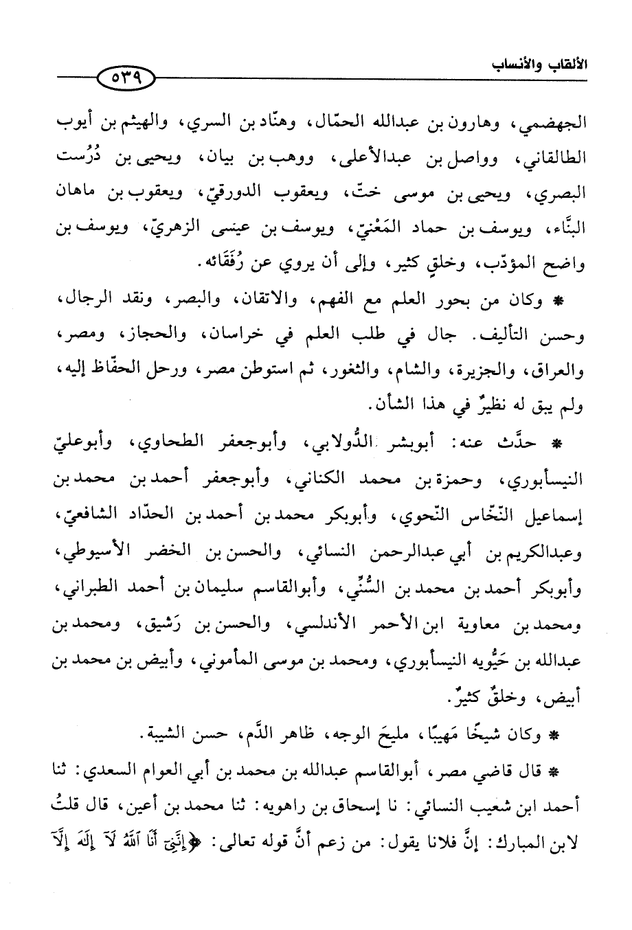 * وكان من بحور العلم مع الفهم، والإتقان، والبصر، ونقد الرجال، وحسن التأليف. جال في طلب العلم في خراسان، والحجاز، ومصر، والعراق، والجزيرة، والشام، والثغور، ثم استوطن مصر، ورحل الحفّاظ إليه، ولم يبق له نظيرٌ في هذا الشأن.