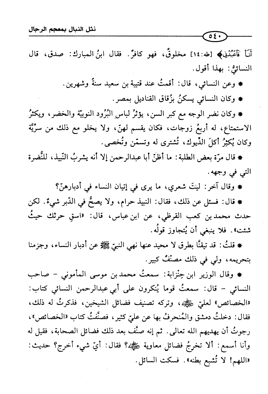 * وقال الوزير ابن حِنْزابة: سمعتُ محمد بن موسى المأموني -صاحب النسائي- قال: سمعتُ قومًا يُنكرون على أبي عبد الرحمن النسائي كتاب: "الخصائص" لعليّ رضي الله عنه، وتركه تصنيف فضائل الشيخين، فذكرتُ له ذلك، فقال: دخلتُ دمشق والمُنحرفُ بها عن عليّ كثير، فصنَّفتُ كتاب "الخصائص"، رجوتُ أن يهديهم الله تعالى. ثم إنه صنَّف بعد ذلك فضائل الصحابة, فقيل له وأنا أسمع: ألا تخرجُ فضائل معاوية رضي الله عنه؟ فقال: أيّ شيء أخرج؟ حديث: "اللهم! لا تُشبع بطنه". فسكت السائل.