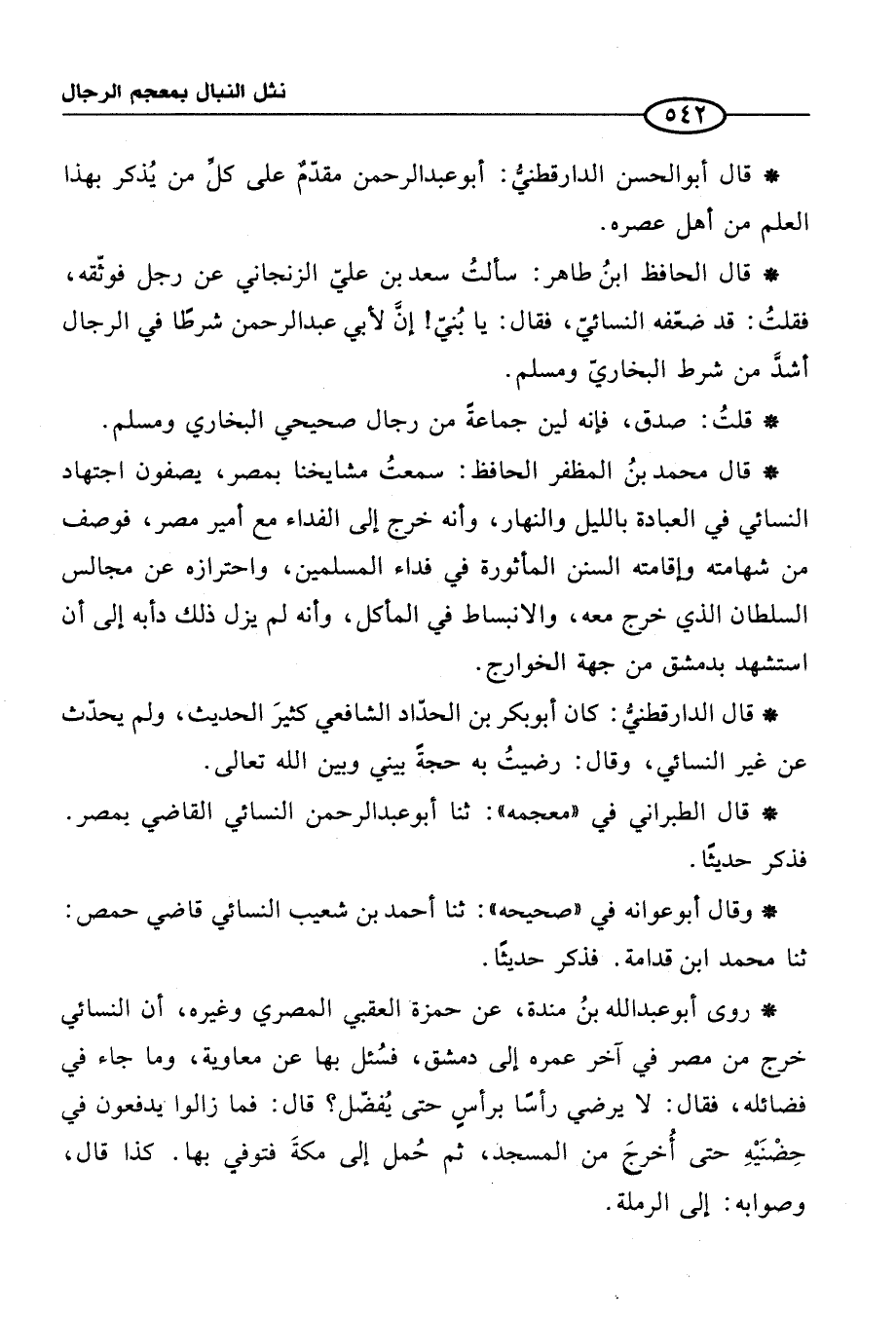 * قال أبو الحسن الدارقطنيُّ: أبو عبد الرحمن مقدّمٌ على كلِّ من يُذكر بهذا العلم من أهل عصره.