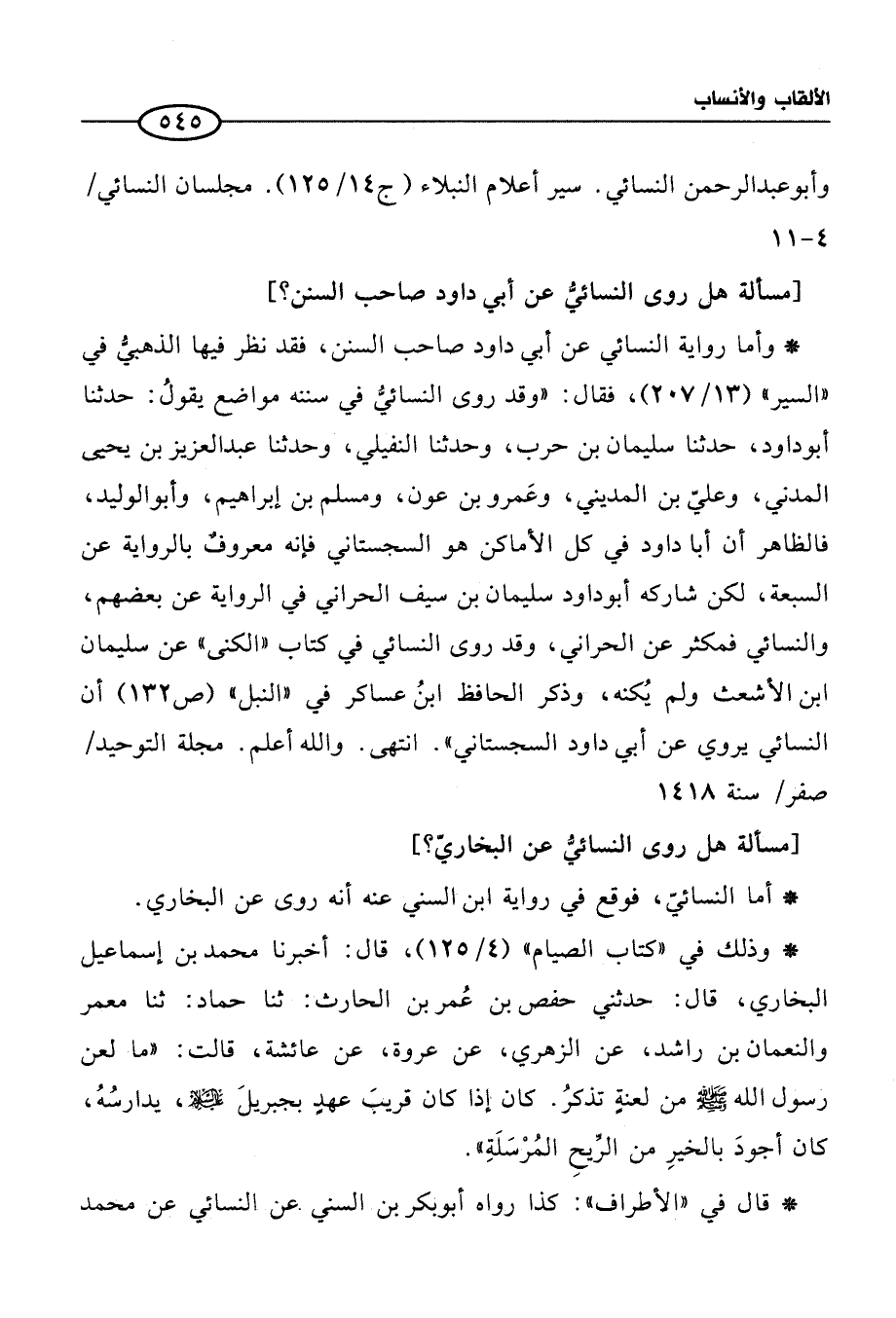 * وأما رواية النسائي عن أبي داود صاحب السنن, فقد نظر فيها الذهبيُّ في "السير" (13/ 207)، فقال: "وقد روى النسائيُّ في سننه مواضع يقولُ: حدثنا أبو داود، حدثنا سليمان بن حرب، وحدثنا النفيلي، وحدثنا عبد العزيز بن يحيى المدني، وعليّ بن المديني، وعَمرو بن عون، ومسلم بن إبراهيم، وأبو الوليد، فالظاهر أن أبا داود في كل الأماكن هو السجستانيِ فإنه معروفٌ بالرواية عن السبعة، لكن شاركه أبو داود سليمان بن سيف الحراني في الرواية عن بعضهم، والنسائي فمكثر عن الحراني، وقد روى النسائي في كتاب "الكني" عن سليمان ابن الأشعث ولم يُكنه، وذكر الحافظ ابنُ عساكر في "النبل" (ص 132) أن النسائي يروي عن أبي داود السجستاني". انتهى. والله أعلم. مجلة التوحيد/ صفر/ سنة 1418