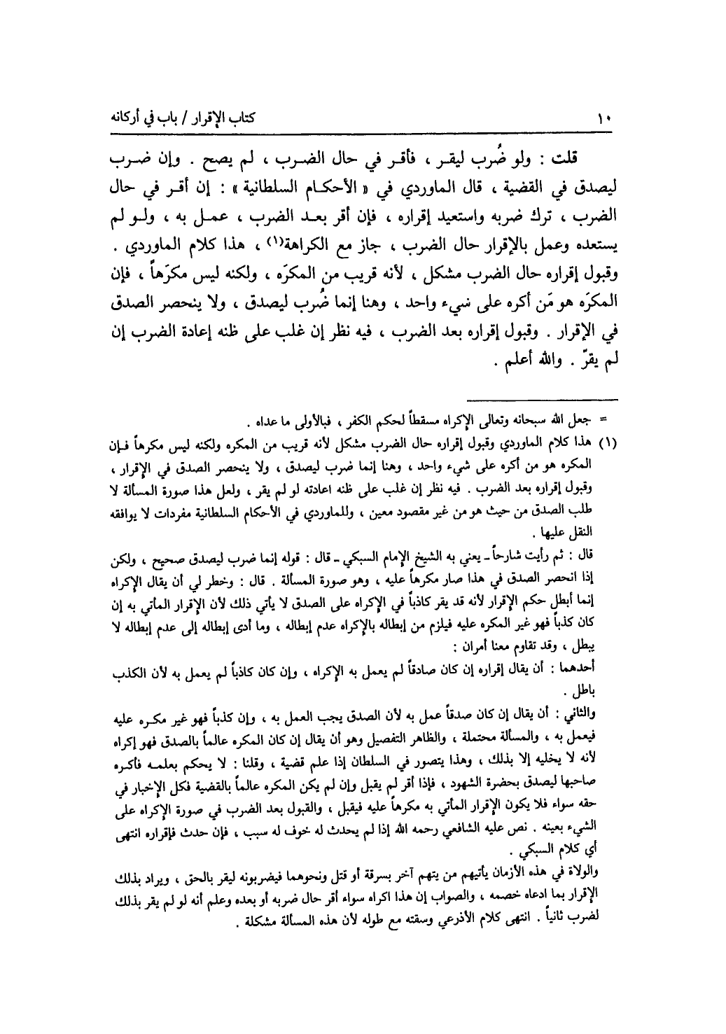 قلت: ولو ضرب ليقر، فأقر في حال الضرب، لم يصح. وإن ضرب ليصدق في القضية، قال الماوردي في الاحكام السلطانية: إن أقر في حال الضرب، ترك ضربه واستعيد إقراره، فإن أقر بعد الضرب، عمل به، ولو لم يستعده وعمل بالاقرار حال الضرب، جاز مع الكراهة، هذا كلام الماوردي. وقبول إقراره حال الضرب مشكل، لانه قريب من المكره ولكنه ليس مكرها، فإن المكره هو من أكره على شئ واحد، وهنا إنما ضرب ليصدق، ولا ينحصر الصدق في الاقرار. وقبول إقراره بعد الضرب، فيه نظر إن غلب على ظنه إعادة الضرب إن لم يقر. والله أعلم.