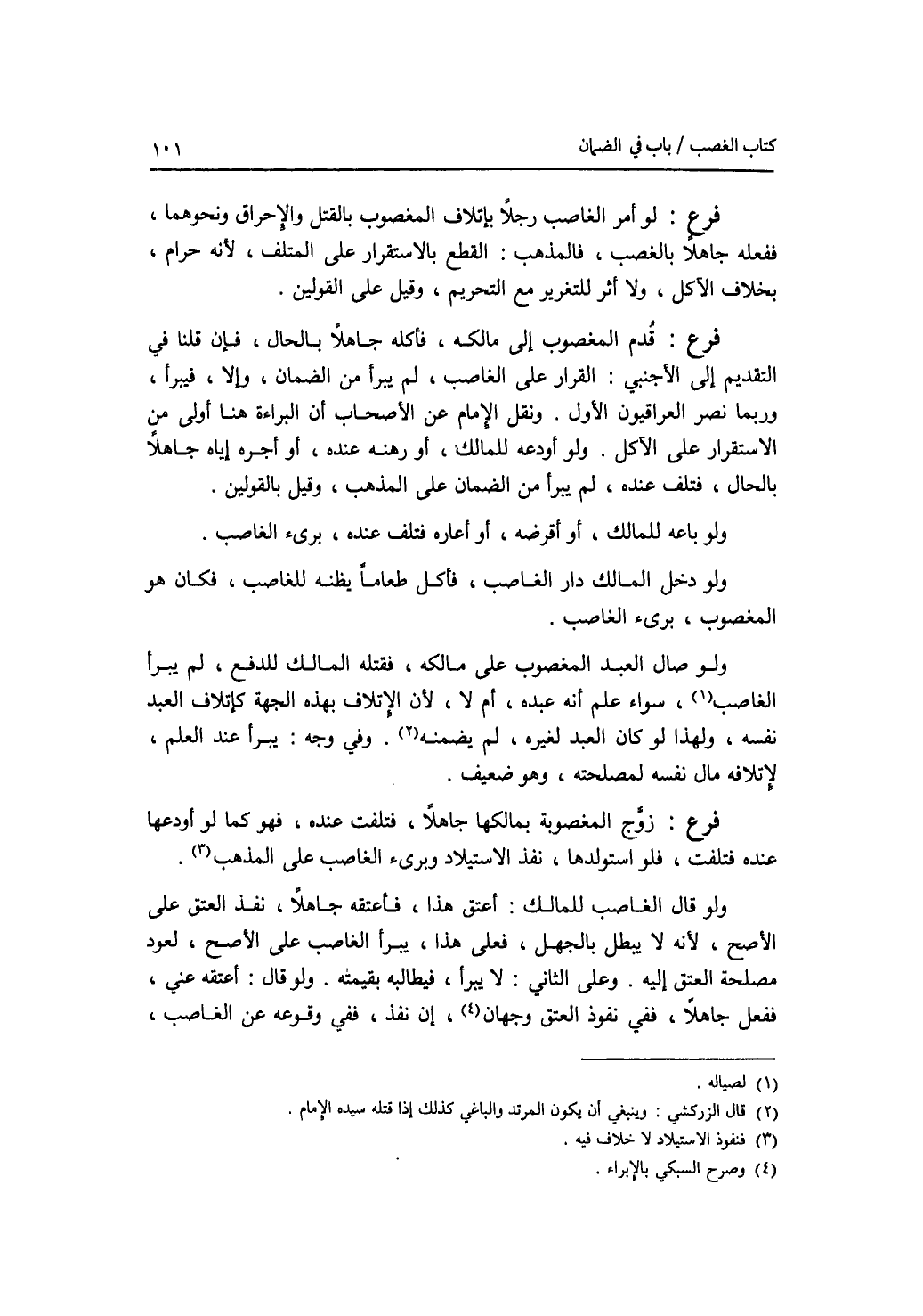 فرع لو أمر الغاصب رجلا باتلاف المغصوب بالقتل والاحراق ونحوهما، ففعله جاهلا بالغصب، فالمذهب: القطع با لاستقرار على المتلف، لانه حرام، بخلاف الاكل، ولا أثر للتغرير مع التحريم، وقيل على القولين. فرع قدم المغصوب إلى مالكه، فأكله جاهلا بالحال، فإن قلنا في التقديم إلى الاجنبي: القرار على الغاصب، لم يبرأ من الضمان. وإلا، فيبرأ، وربما نصر العراقيون الاول. ونقل الامام عن الاصحاب إن البراءة هنا أولى من الاستقرار على الاكل. ولو أودعه للمالك، أو رهنه عنده، أو أجره إياه جاهلا بالحال، فتلف عنده، لم يبرأ من الضمان على المذهب، وقيل بالقولين. ولو باعه للمالك، أو أقرضه، أو أعاره فتلفت عنده، برئ الغاصب. ولو دخل المالك دار الغاصب، فأكل طعاما يظنه للغاصب، فكان هو المغصوب، برئ الغاصب، ولو صال العبد المغصوب على مالكه، فقتله المالك للدفع، لم يبرأ الغاصب، سواء علم أنه عبده، أم لا، لان الاتلاف بهذه الجهة كاتلاف العبد نفسه، ولهذا لو كان العبد لغيره، لم يضمنه. وفي وجه: يبرأ عند العلم، لاتلافه مال نفسه لمصلحته، وهو ضعيف. فرع زوج المغصوبة بمالكها جاهلا، فتلفت عنده، فهو كما لو أودعها عنده فتلفت، فلو استولدها، نفذ الاستيلاد وبرء الغاصب على المذهب. ولو قال الغاصب للمالك: أعتق هذا، فأعتقه جاهلا، نفذ العتق على الاصح، لانه لا يبطل بالجهل، فعلى هذا، يبرأ الغاصب على الاصح، لعود مصلحة العتق إليه. وعلى الثاني: لا يبرأ، فيطالبه بقيمته. ولو قال: أعتقه عني، ففعل جاهلا، ففي نفوذ العتق وجهان، إن نفذ، ففي وقوعه عن الغاصب،