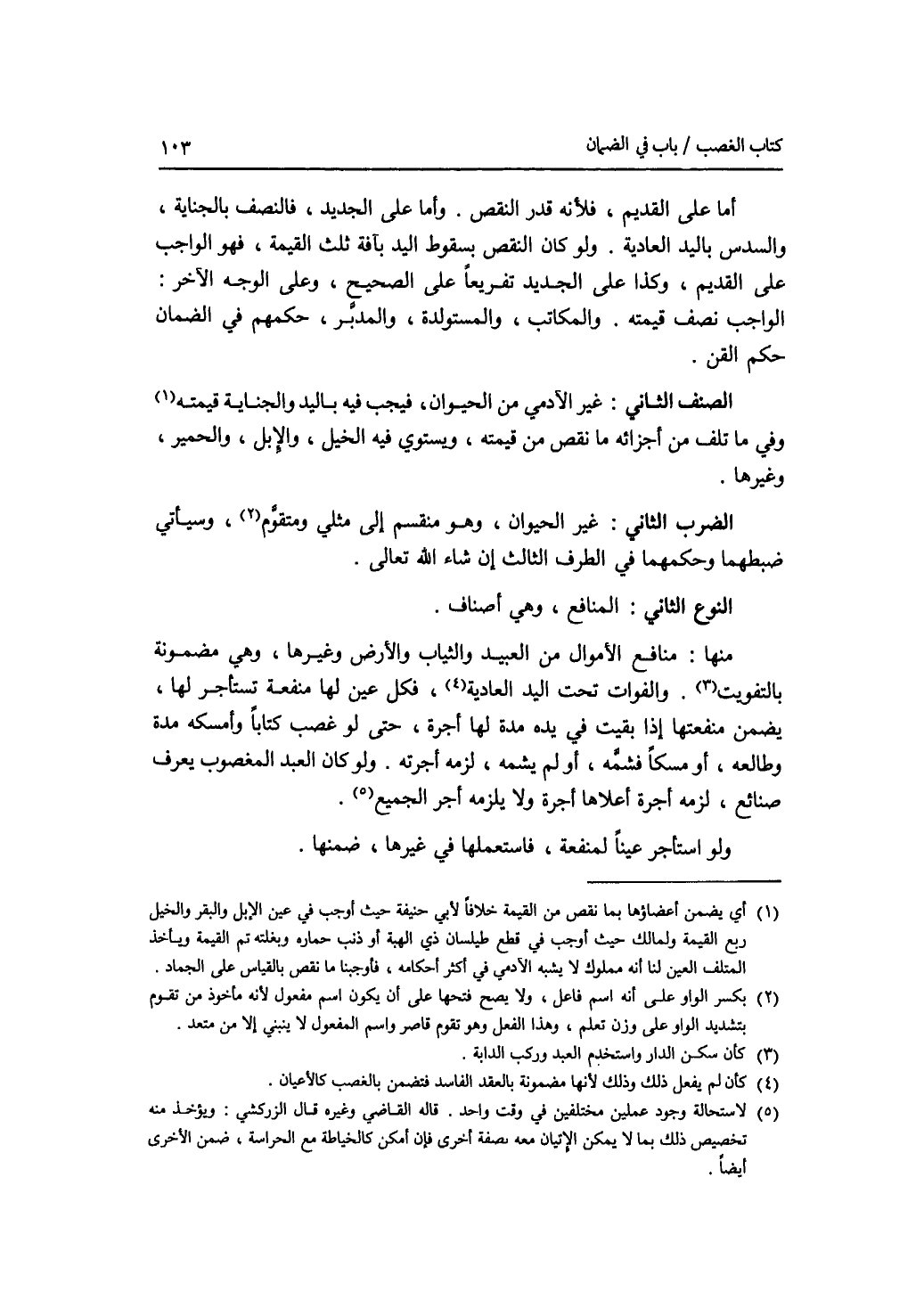 أما على القديم، فلانه قدر النقص. وأما على الجديد، فالنصف بالجناية، والسدس باليد العادية. ولو كان النقص بسقوط اليد بآفة ثلث القيمة، فهو الواجب على القديم، وكذا على الجديد تفريعا على الصحيح، وعلى الوجه الاخر: الواجب نصف قيمته. والمكاتب، والمستولدة، والمدبر، حكمهم في الضمان حكم القن. الصنف الثاني: غير الادمي من الحيوان، فيجب فيه باليد والجناية قيمته، وفي ما تلف من أجزائه ما نقص من قيمته، ويستوي فيه الخيل، والابل، والحمير، وغيرها. الضرب الثاني: غير الحيوان، وهو منقسم إلى مثلي ومتقوم، وسيأتي ضبطهما وحكمهما في الطرف الثالث إن شاء الله تعالى. النوع الثاني: المنافع، وهي أصناف. منها: منافع الاموال من العبيد والثياب والارض وغيرها، وهي مضمونة بالتفويت. والفوات تحت اليد العادية، فكل عين لها منفعة تستأجر لها، يضمن منفتها إذا بقيت في يده مدة لها أجرة حتى لو غصب كتابا وأمسكه مدة وطالعه، أو مسكا فشمه، أو لم يشمه، لزمه أجرته. ولو كان العبد المغصوب يعرف صنائع، لزمه أجرة أعلاها أجرة، ولا يلزمه أجر الجميع. ولو استأجر عينا لمنفعة، فاستعملها في غيرها، ضمنها.
