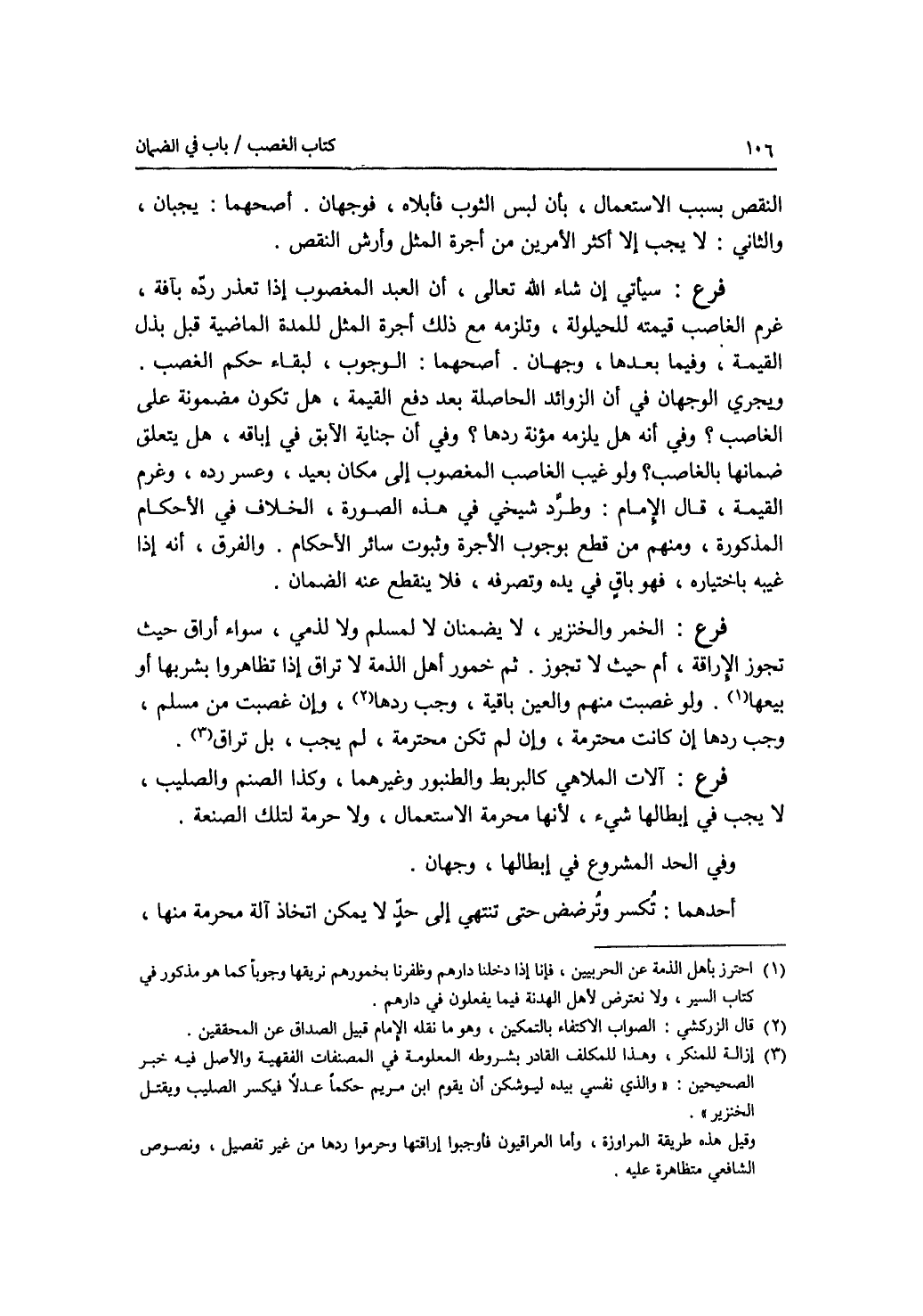 النقص بسبب الاستعمال، بأن لبس الثوب فأبلاه، فوجهان. أصحهما: يجبان، والثاني: لا يجب إلا أكثر الامرين من أجرة المثل وأرش النقص. فرع سيأتي إن شاء الله تعالى، أن العبد المغصوب إذا تعذر رده بآفة، غرم الغاصب قيمته للحيلولة، وتلزمه مع ذلك أجرة المثل للمدة الماضية قبل بذل القيمة، وفيما بعدها، وجهان. أصحهما: الوجوب، لبقاء حكم الغصب. ويجري الوجهان في أن الزوائد الحاصلة بعد خفع القيمة، هل تكون مضمونة على الغاصب ؟ وفي أنه هل يلزمه مؤنة ردها ؟ وفي أن جناية الابق في إباقه، هل يتعلق ضمانها بالغاصب ؟ ولو غيب الغاصب المغصوب إلى مكان بعيد، وعسر رده، وغرم القيمة، قال الامام: وطرد شيخي في هذه الصورة، الخلاف في الاحكام المذكورة، ومنهم من قطع بوجوب الاجرة وثبوت سائر الاحكام. والفرق، أنه إذا غيبه بإختياره، فهو باق في يده وتصرفه، فلا ينقطع عنه الضمان. فرع الخمر والخنزير، لا يضمنان (لا) لمسلم ولا لذمي، سواء أراق حيث تجوز الاراقة، أم حيث لا تجوز، ثم خمور أهل الذمة لا تراق إلا إذا تظاهروا بشر بها أو بيعها، ولو غصب منهم والعين باقية، وجب ردها، وإن غصبت من مسلم، وجب ردها إن كانت محترمة، وإن لم تكن محترمة، لم يجب، بل تراق. فرع آلات الملاهي كالبربط والطنبور وغيرهما، وكذا الصنم والصليب، لا يجب في إبطالها شئ، لانها محرمة الاستعمال، ولا حرمة لتلك الصنعة. وفي الحد المشروع في إبطالها، وجهان. أحدهما: تكسر وترضى حتى تنتهي إلى حد لا يمكن اتخاذ آلة محرمة منها،