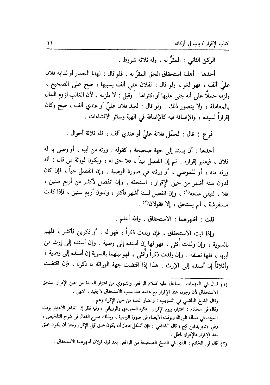 الركن الثاني : المقر له، وله ثلاثة شروط. أحدها: أهلية استحقاق الحق المقر به. فلو قال: لهذا الحمار أو لدابة فلان علي ألف، فهو لغو، ولو قال: لفلان علي ألف بسببها، صح على الصحيح، ولزمه حملا على أنه جنى عليها أو اكتراها. وقيل: لا يلزمه، لان الغالب لزوم المال بالمعاملة، ولا يتصور ذلك. ولو قال: لعبد فلان علي أو عندي ألف، صح وكان إقرارا لسيده، والاضافة فيه كالاضافة في الهبة وسائر الانشاءات. فرع قال: لحمل فلانة علي أو عندي ألف، فله ثلاثة أحوال. أحدها: أن يسند إلى جهة صحيحة، كقوله: ورثه من أبيه، أو وصى به له فلان، فيعتبر إقراره. ثم إن انفصل ميتا، فلا حق له، ويكون لورثة من قال: أنه ورثه منه، أو للموصي، أو ورثته في صورة الوصية. وإن انفصل حيا، فإن كان لدون ستة أشهر من حين الاقرار، استحقه. وإن انفصل لاكثر من أربع سنين، فلا، لتيقن عدمه، وإن انفصل لستة أشهر فأكثر، ولدون أربع سنين، فإن كانت مستفرشة، لم يستحق، وإلا فقولان. قلت: أظهرهما: الاستحقاق. والله أعلم. وإذا ثبت الاستحقاق، فإن ولدت ذكرا، فهو له. أو ذكرين فأكثر، فلهم بالسوية، وإن ولدت انثى، فهو لها إن أسنده إلى وصية. وإن أسنده إلى إرث من أبيها، فلها نصفه. وإن ولدت ذكرا وأنثى، فهو بينهما بالسوية إن أسنده إلى وصية، وأثلاثا إن أسنده إلى الارث. هذا إذا اقتضت جهة الوراثة ما ذكرنا، فإن اقتضت