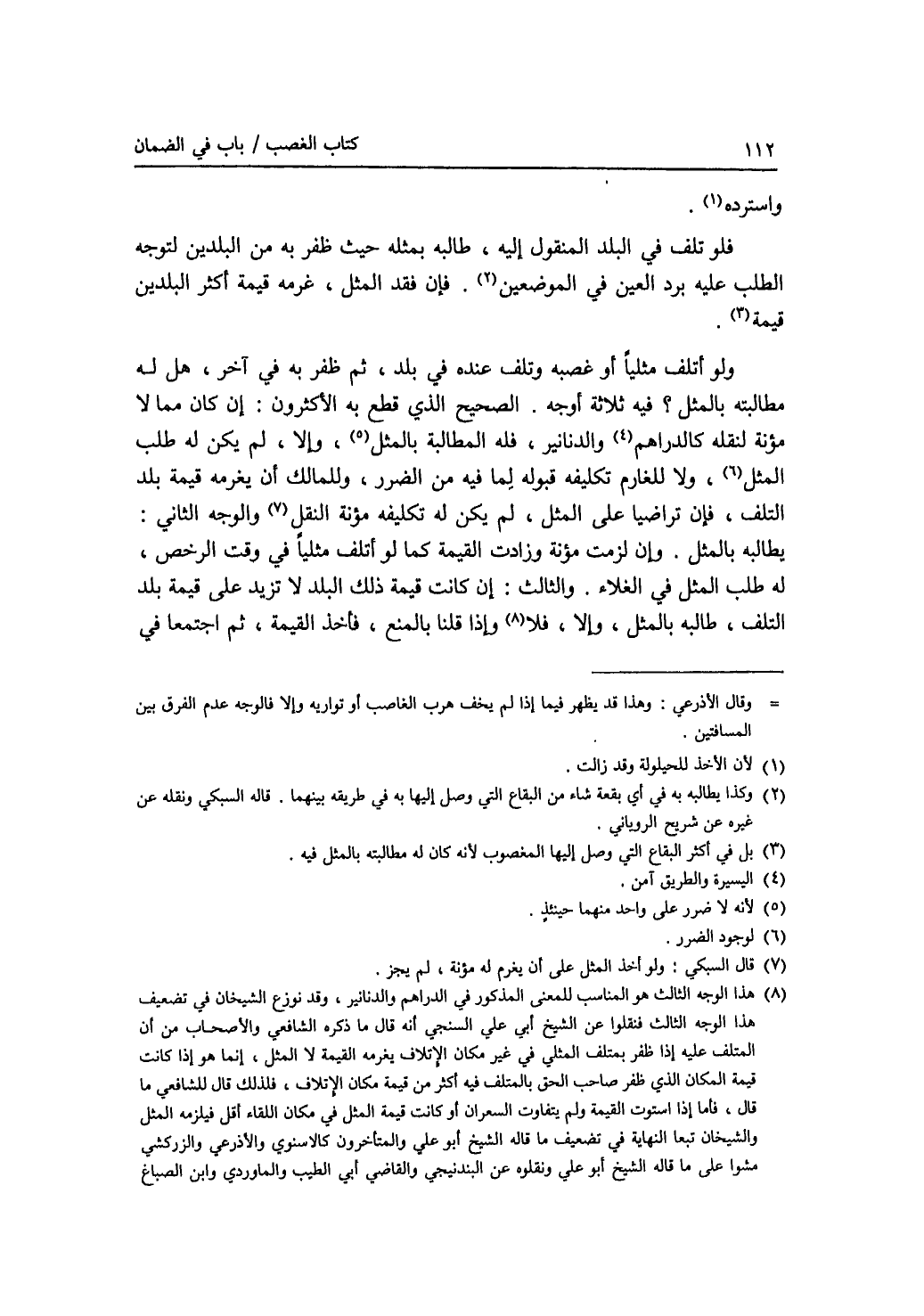 واسترده. فلو تلف في البلد المنقول إليه، طالبه بمثله حيث ظفر به من البلدين لتوجه الطلب عليه برد العين في الموضعين. فإن فقد المثل، غرمه (قيمة) أكثر البلدين قيمة. ولو اتلف مثليا أو غصبه وتلف عنده في بلد، ثم ظفر به في آخر، هل له مطالبته بالمثل ؟ فيه ثلاثة أوجه. الصحيح الذي قطع به الاكثرون: إن كان مما لا مؤنة لنقله كالدراهم والدنانير، فله المطالبة بالمثل، وإلا، لم يكن له طلب المثل، وللغارم تكليفه قبوله لما فيه من الضرر، وللمالك أن يغرمه قيمة بلد التلف، فإن تراضيا على المثل، لم يكن له تكليفه مؤنة النقل. والوجه الثاني: بطالبه بالمثل. وإن لزمت مؤنة وزادت القيمة كما لو أتلف مثليا في وقت الرخص، له طلب المثل في الغلاء. والثالث: إن كانت قيمة ذلك البلد لا تزيد على قيمة بلد التلف، طالبه بالمثل، وإلا، فلا. وإذا قلنا بالمنع، فأخذ القيمة، ثم اجتمعا في