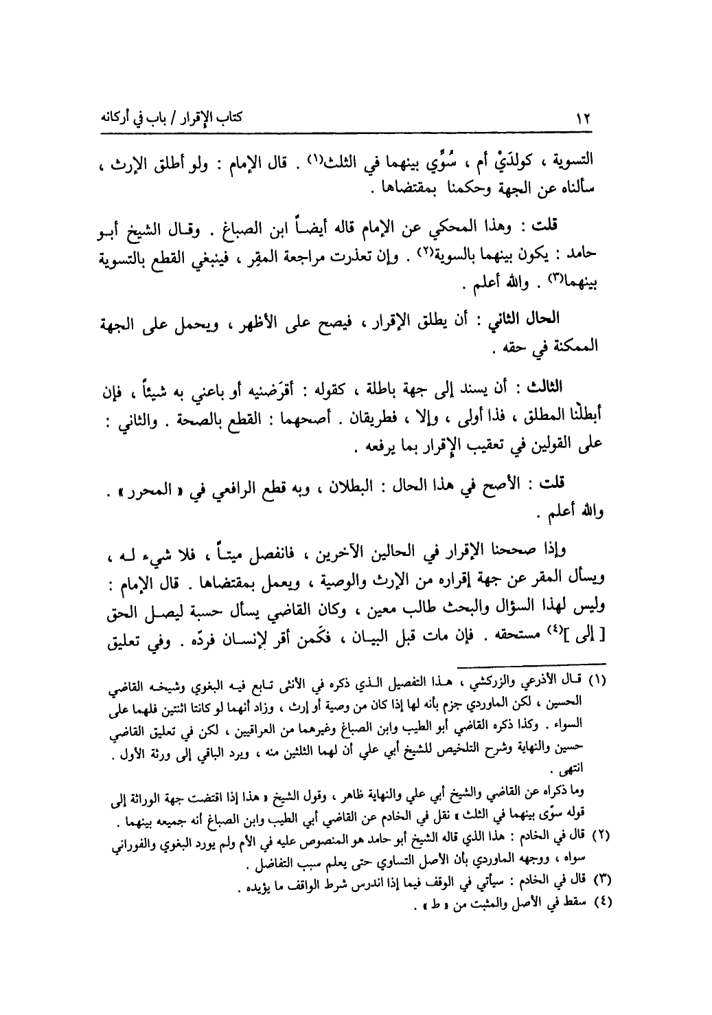 التسوية، كولدي أم، سوي بينهما في الثلث. قال الامام: ولو أطلق الارث، سألناه عن الجهة وحكمنا بمقتضاها. قلت: وهذا المحكي عن الامام قاله أيضا ابن الصباغ. وقال الشيخ أبو حامد: يكون بينهما بالسوية. وإن تعذرت مراجعة المقر، فينبغي القطع بالتسوية بينهما. والله أعلم. الحال الثاني: أن يطلق الاقرار، فيصح على الاظهر، ويحمل على الجهة الممكنة في حقه. الثالث: أن يسند إلى جهة باطلة، كقوله: أقرضنيه أو باعني به شيئا، فإن أبطلنا المطلق، فذا أولى، وإلا، فطريقان. أصحهما: القطع بالصحة. والثاني: على القولين في تعقيب الاقرار بما يرفعه. قلت: الاصح في هذا الحال: البطلان، وبه قطع الرافعي في المحرر. والله أعلم. وإذا صححنا الاقرار في الحالين الآخرين، فانفصل ميتا، فلا شئ له، ويسأل المقر عن جهة إقراره من الارث والوصية، ويعمل بمقتضاها. قال الامام: وليس لهذا السؤال والبحث طالب معين، وكان القاضي يسأل حسبة ليصل الحق (إلى) مستحقه. فإن مات قبل البيان، فكمن أقر لانسافرده. وفي تعليق