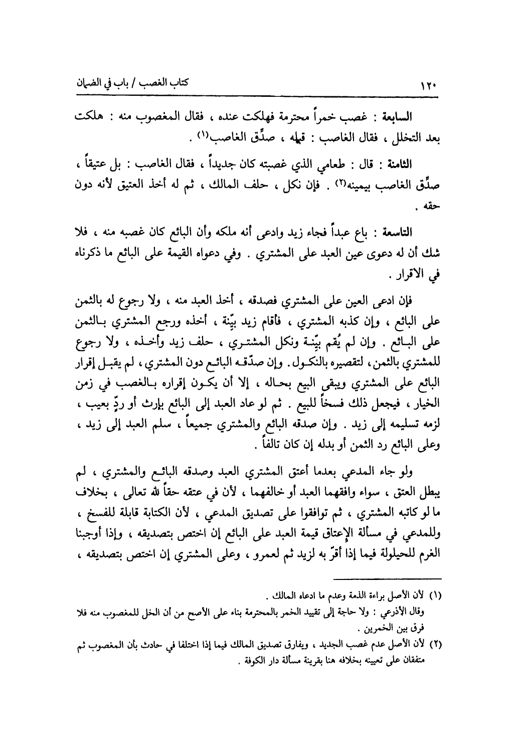 السابعة: غصب خمرا محترمة فهلكت عنده، فقال المغصوب منه: هلكت بعد التخلل، فقال الغاصب: قبله، صدق الغاصب. الثامنة: قال: طعامي الذي غصبته كان جديدا، فقال الغاصب: بل عتيقا، صدق الغاصب بيمينه. فإن نكل، حلف المالك، ثم له أخذ العتيق لانه دون حقه. التاسعة: باع عبدا فجاء زيد وأدعى أنه ملكه وأن البائع كان غصبه منه، فلا شك أن له دعوى عين العبد على المشتري. وفي دعواه القيمة على البائع ما ذكرناه في الاقرار. فإن ادعى العين على المشتري فصدقه، أخذ العبد منه، ولا رجوع له بالثمن على البائع. وإن كذبه المشتري، فأقام زيد بينة، أخذه ورجع المشتري بالثمن على البائع. وإن لم يقم بينة ونكل المشتري، حلف زيد وأخذه، ولا رجوع للمشتري بالثمن، لتقصيره بالنكول. وإن صدقه البائع دون المشتري، لم يقبل إقرار البائع على المشتري ويبقى البيع بحاله، إلا أن يكون إقراره بالغصب في زمن الخيار، فيجعل ذلك فسخا للبيع. ثم لو عاد العبد إلى البائع بارث أو رد بعيب، لزمه تسليمه إلى زيد. وإن صدقه البائع والمشتري جميعا، سلم العبد إلى زيد، وعلى البائع رد الثمن أو بدله إن كان تالفا. ولو جاء المدعي بعدما أعتق المشتري العبد وصدقه البائع والمشتري، لم يبطل العتق، سواء وافقهما العبد أو خالفهما، لان في عتقه حقا لله تعالى، بخلاف ما لو كاتبه المشتري، ثم توافقوا على تصديق المدعي، لان الكتابة قابلة للفسخ. وللمدعي في مسألة الاعتاق قيمة العبد على البائع جن اختص بتصديقه، وإذا أوجبنا الغرم للحيلولة فيما إذا أقر به لزيد ثم لعمرو، وعلى المشتري إن اختص بتصديقه،