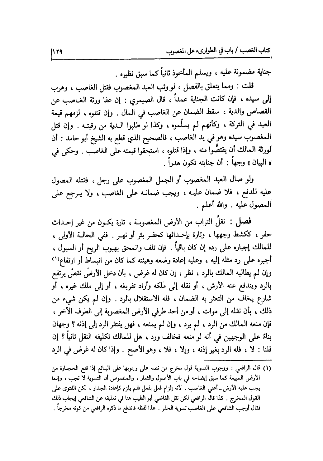 فصل نقل التراب من الارض المغصوبة، تارة يكون من غير إحداث حفر، ككشط وجهها، وتارة باحداثها كحفر بئر أو نهر. ففي الحالة الاولى، للمالك إجباره على رده إن كان باقيا. فإن تلف وانمحق بهبوب الريح أو السيول، أجبره على رد مثله إليه، وعليه إعادة وضعه وهيئته كما كان من انبساط أو ارتفاع. وإن لم يطالبه المالك بالرد، نظر، إن كان له غرض، بأن دخل الارض نقص يرتفع بالرد ويندفع عنه الارش، أو نقله إلى ملكه وأراد تفريغه، أو إلى ملك غيره، أو شارع يخاف من التعثر به الضمان، فله الاستقلال بالرح. وإن لم يكن شئ من ذلك، بأن نقله إلى موات، أو من أحد طرفي الارض المغصوبة إلى الطرف الاخر، فإن منعه المالك من الرد، لم يرد، وإن لم يمنعه، فهل يفتقر الرد إلى إذنه ؟ وجهان بناء على الوجهين في أنه لو منعه فخالف ورد، هل للمالك تكليفه النقل ثانيا ؟ إن قلنا: لا، فله الرد بغير إذنه، وإلا، فلا، وهو الاصح. وإذا كان له غرض في الرد