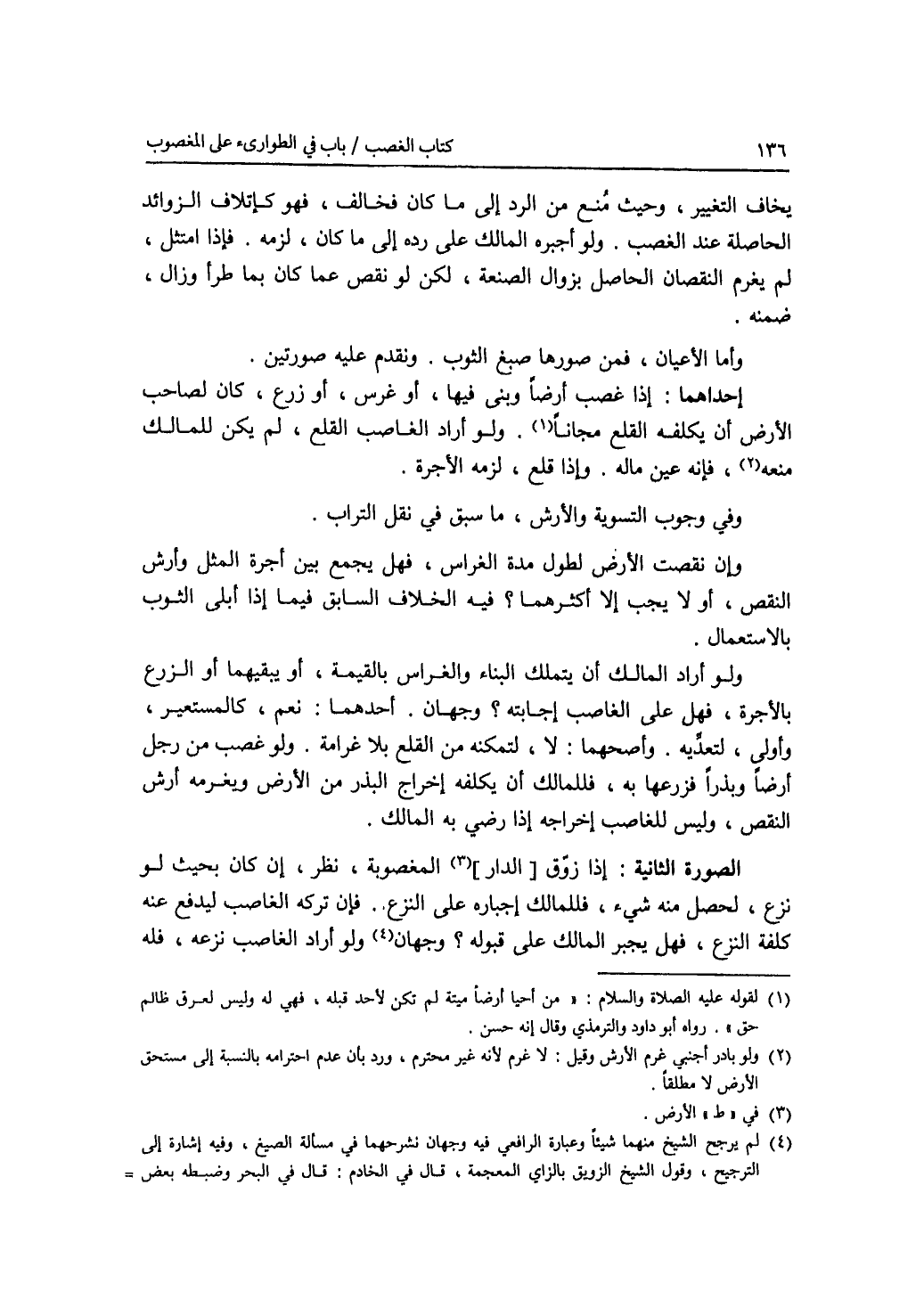 يخاف التغيير، وحيث منع من الرد إلى ما كان فخالف، فهو كاتلاف الزوائد الحاصلة عند الغصب. ولو أجبره المالك على رده إلى ما كان، لزمه. فإذا امتثل، لم يغرم النقصان الحاصل بزوال الصنعة، لكن لو نقص عما كان بما طرأ وزال، ضمنه. وأما الاعيان، فمن صورها صبغ الثوب. وتقدم عليه صورتين. إحداهما: إذا غصب أرضا وبنى فيها، أو غرس، أو زرع، كان لصاحب الارض أن يكلفه القلع مجانا. ولو أراد الغاصب القلع لم يكن للمالك منعه، فإنه عين ماله. وإذا قلع، لزمه الاجرة. وفي وجوب التسوية والارش، ما سبق في نقل التراب. وإن نقصت الارض لطول مدة الغراس، فهل يجمع بين أجرة المثل وأرش النقص، أو لا يجب إلا أكثرهما ؟ فيه الخلاف السابق فيما إذا أبلى الثوب بالاستعمال. ولو أراد المالك أن يتملك البناء والغراس بالقيمة، أو يبقيهما أو الزرع بالاجرة، فهل على الغاصب إجابته ؟ وجهان. أحدهما: نعم، كالمستعير، وأولى، لتعديه. وأصحهما: لا، لتمكنه من القلع بلا غرامة. ولو غصب من رجل أرضا وبذرا فزرعها به، فللمالك أن يكلفه إخراج البذر من الارض ويغرمه أرش النقص، وليس للغاصب إخراجه إذا رضي به المالك. الصورة الثانية: إذا زوق الارض المغصوبة، نظر إن كان بحيث لو نزع، لحصل منه شئ، فللمالك إجباره على النزع. فإن تركه الغاصب ليدفع عنه كلفة النزع، فهل يجبر المالك على قبوله ؟ وجهان ولو أراد الغاصب نزعه، فله