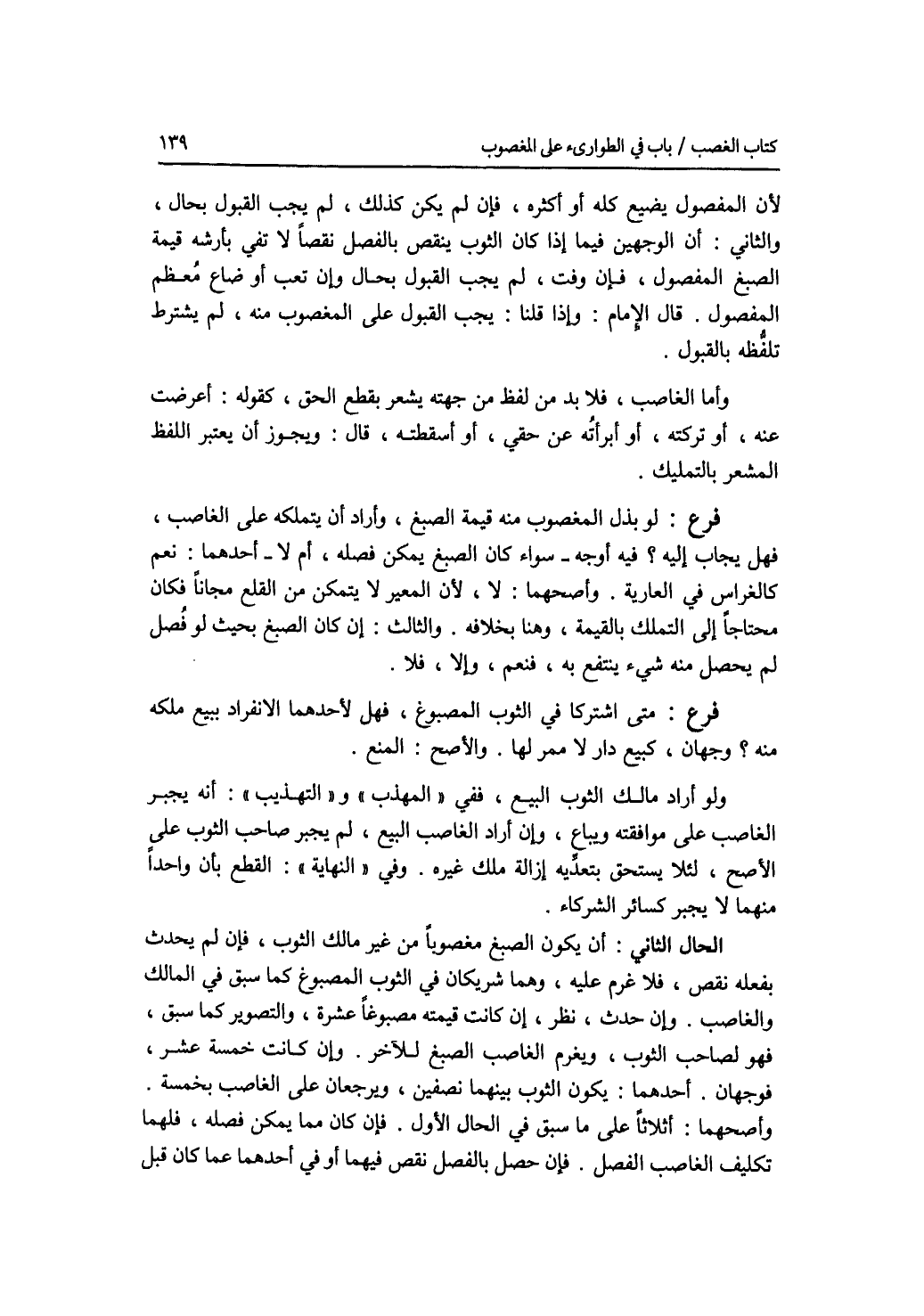 لان المفصول يضيع كله أو أكثره، فإن لم يكن كذلك، لم يجب القبول بحال. والثاني: أن الوجهين فيما إذا كان الثوب ينقص بالفصل نقصا لا تفي بأرشه قيمة الصبغ المفصول، فإن وقت، لم يجب القبول بحال وإن تعب أو ضاع معظم المفصول. قال الامام: وإذا قلنا: يجب القبول على المغصوب منه، لم يشترط تلفظه بالقبول. وأما الغاصب، فلا بد من لفظ من جهته يشعر بقطع الحق، كقوله: أعرضت عنه، أو تركته، أو أبرأته عن حقي، أو أسقطته، قال: ويجوز أن يعتبر اللفظ المشعر بالتمليك. فرع لو بذل المغصوب منه قيمة الصبغ، وأراد أن يتملكه على الغاصب، فهل يجاب إليه ؟ فيه أوجه - سواء كان الصبغ يمكن فصله، أم لا - أحدهما: نعم كالغراس في العارية. وأصحهما: لا، لان المعير لا يتمكن من القلع مجانا فكان محتاجا إلى التملك بالقيمة، وهنا بخلافه. والثالث: إن كان الصبغ بحيث لو فصل لم يحصل منه شئ ينتفع به، فنعم، وإلا، فلا. فرع متى اشتركا في الثوب المصبوغ، فهل لاحدهما الانفراد ببيع ملكه (منه) ؟ وجهان، كبيع دار لا ممر لها. والاصح: المنع. ولو أراد مالك الثوب البيع، ففي المهذب والتهذيب: أنه يجبر الغاصب على موافقته ويباع، وإن أراد الغاصب البيع، لم يجبر صاحب الثوب على الاصح، لئلا يستحق بتعديه إزالة ملك غيره. وفي النهاية: القطع بأن واحدا منهما لا يجبر كسائر الشركاء. الحال الثاني: أن يكون الصبغ مغصوبا من غير مالك الثوب، فإن لم يحدث بفعله نقص، فلا غرم عليه، وهما شريكان في الثوب المصبوغ كما سبق في المالك والغاصب. وإن حدث، نظر، إن كانت قيمته مصبوغا عشرة، والتصوير كما سبق، فهو لصاحب الثوب، ويغرم الغاصب الصبغ للآخر. وإن كانت خمسة عشر، فوجهان. أحدهما: (يكون) الثوب بينهما نصفين، ويرجعان على الغاصب بخمسة. وأصحهما: أثلاثا على ما سبق في الحال الاول. فإن كان مما يمكن فصله، فلهما تكليف الغاصب الفصل. فإن حصل بالفصل نقص فيهما أو في أحدهما عما كان قبل