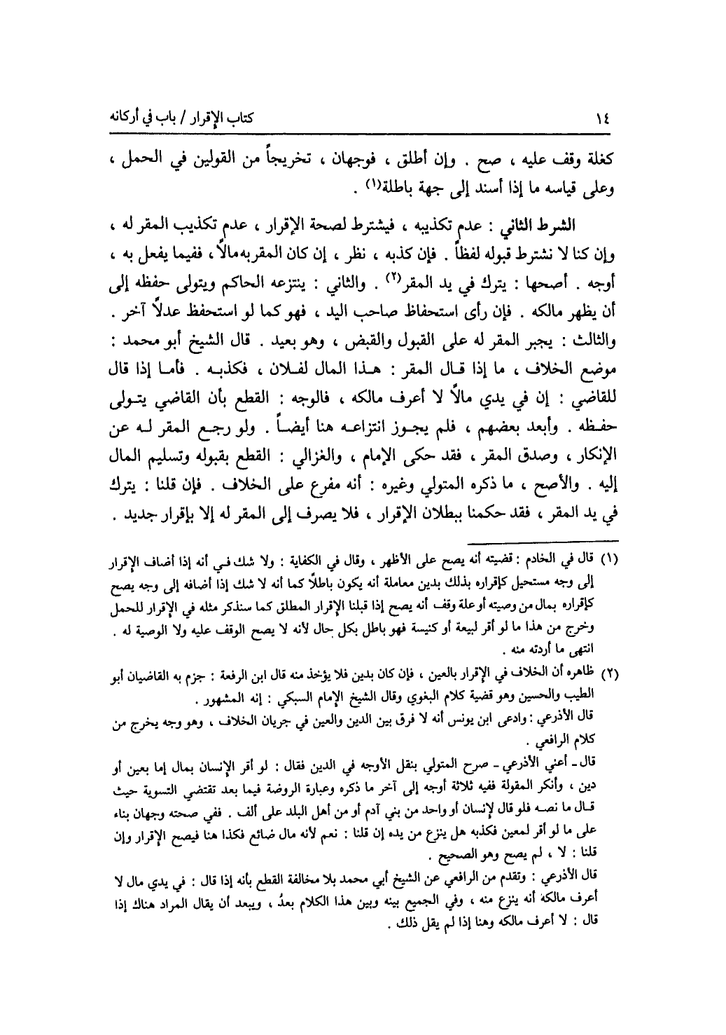 كغلوقف عليه، صح. وإن أطلق، فوجهان، تخريجا من القولين في الحمل، وعلى قياسهما إذا اسند إلى جهة باطلة. الشرط الثاني: عدم تكذيبه، فيشترط لصحة الاقرار، عدم تكذيب المقر له، وإن كنا لا نشترط قبوله لفظا. فإن كذبه، نظر، إن كان المقر به مالا، ففيما يفعل به، أوجه. أصحها: يترك في يد المقر. والثاني: ينتزعه الحاكم ويتولى حفظه إلى أن يظهر مالكه. فإن رأى استحفاظ صاحب اليد، فهو كما لو استحفظ عدلا آخر. والثالث: يجبر المقر له على القبول والقبض، وهو بعيد. قال الشيخ أبو محمد: موضع الخلاف، ما إذا قال المقر: هذا المال لفلان فكذبه. فأما إذا قال للقاضي: إن في يدي مالا لا أعرف مالكه، فالوجه: القطبأن القاضي يتولى حفظه. وأبعد بعضهم، فلم يجوز انتزاعه هنا أيضا. ولو رجع المقر له عن الانكار، وصدق المقر، فقد حكى الامام، والغزالي: القطع بقبوله وتسليم المال إليه. والاصح، ما ذكره المتولي وغيره: أنه مفرع على الخلاف. فإن قلنا: يترك في يد المقر، فقد حكمنا ببطلان الاقرار، فلا يصرف إلى المقر له إبإقرار جديد.
