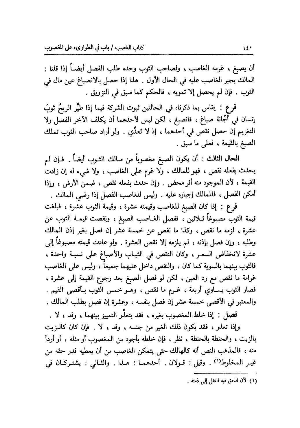 أن يصبغ، غرمه الغاصب، ولصاحب الثوب وحده طلب الفصل أيضا إذا قلنا: المالك يجبر الغاصب عليه في الحال الاول. هذا إذا حصل بالانصباغ عين مال في الثوب. فإن لم يحصل إلا تمويه، فالحكم كما سبق في التزويق. فرع يقاس بما ذكرناه في الحالتين ثبوت الشركة فيما إذا طير الريح ثوب إنسان في أجانة صباغ، فانصبغ، لكن ليس لاحدهما أن يكلف الاخر الفصل ولا التغريم إن حصل نقص في أحدهما، إذ لا تعدي. ولو أراد صاحب الثوب تملك الصبغ بالقيمة، فعلى ما سبق. الحال الثالث: أن يكون الصبغ مغصوبا من مالك الثوب أيضا. فإن لم يحدث بفعله نقص، فهو للمالك، ولا غرم على الغاصب، ولا شئ له إن زادت القيمة، لان الموجود منه أثر محض. وإن حدث بفعله نقص، ضمن الارش، وإذا أمكن الفصل، فللمالك إجباره عليه. وليس للغاصب الفصل إذا رضي المالك. فرع إذا كان الصبغ للغاصب وقيمته عشرة، وقيمة الثوب عشرة، فبلغت قيمة الثوب مصبوغا ثلاثين، ففصل الغاصب الصبغ، ونقصت قيمة الثوب عن عشرة، لزمه ما نقص، وكذا ما نقص عن خمسة عشر إن فصل بغير إذن المالك وطلبه، وإن فصل بإذنه، لم يلزمه إلا نقص العشرة. ولو عادت قيمته مصبوغا إلى عشرة لانخفاض السعر وكان النقص في الثياب والاصباغ على نسبة واحدة، فالثوب بينهما بالسوية كما كان، والنقص داخل عليهما جميعا، وليس على الغاصب غرامة ما نقص مع رد العين، لكن لو فصل الصبغ بعد رجوع القيمة إلى عشرة، فصار الثوب يساوي أربعة، غرم ما نقص، وهو خمس الثوب بأقصى القيم. والمعتبر في الاقصى خمسة عشر إن فصل بنفسه، وعشرة إن فصل بطلب المالك.