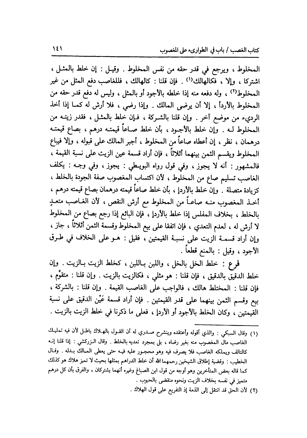 المخلوط، ويرجع في قدر حقه من نفس المخلوط. وقيل: إن خلط بالمثل، اشتركا، وإلا، فكالهالك. فإن قلنا: كالهالك، فللغاصب دفع المثل من غير المخلوط، وله دفعه منه إذا خلطه بالاجود أو بالمثل، وليس له دفع قدر حقه من المخلوط بالاردإ، إلا أن يرضى المالك. وإذا رضي، فلا أرش له كما إذا أخذ الردئ من موضع آخر. وإن قلنا بالشركة، فإن خلط بالمثل، فقدر زيته من المخلوط له. وإن خلط بالاجود، بأن خلط صاعا قيمته درهم، بصاع قيمته درهمان، نظر، إن أعطاه صاعا من المخلوط، أجبر المالك على قبوله، وإلا فيباع المخلوط ويقسم الثمن بينهما أثلاثا، فإن أراد قسمة عين الزيت على نسبة القيمة، فالمشهور: أنه لا يجوز، وفي قول رواه البويطي: يجوز، وفي وجه: يكلف الغاصب تسليم صاع من المخلوط، لان اكتساب المغصوب صفة الجودة بالخلط، كزيادة متصلة. وإن خلط بالاردإ، بأن خلط صاعا قيمته درهمان بصاع قيمته درهم، أخذ المغصوب منه صاعا من المخلوط مع أرش النقص، لان الغاصب متعد بالخلط، بخلاف المفلس إذا خلط بالاردإ، فإن البائع إذا رجع بصاع من المخلوط لا أرش له، لعدم التعدي، فإن اتفقا على بيع المخلوط وقسمة الثمن أثلاثا، جاز، وإن أراد قسمة الزيت على نسبة القيمتين، فقيل: هو على الخلاف في طرق الاجود، وقيل: بالمنع قطعا. فرع خلط الخل بالخل، واللبن باللبن، كخلط الزيت بالزيت. وإن خلط الدقيق بالدقيق، فإن قلنا: هو مثلي، فكالزيت بالزيت. وإن قلنا: متقوم، فإن قلنا: المختلط هالك، فالواجب على الغاصب القيمة. وإن قلنا: بالشركة، بيع وقسم الثمن بينهما على قدر القيمتين. فإن أراد قسمة عين الدقيق على نسبة القيمتين، وكان الخلط بالاجود أو الاردإ، فعلى ما ذكرنا في خلط الزيت بالزيت.